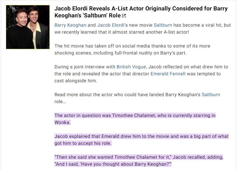 Jacob Elordi 透露,《萨特本》导演 Emerald Fennell 原本想让 Timothée Chalamet 饰演男主Oliver,但是Jacob Elordi主动点名要Barry Keoghan!