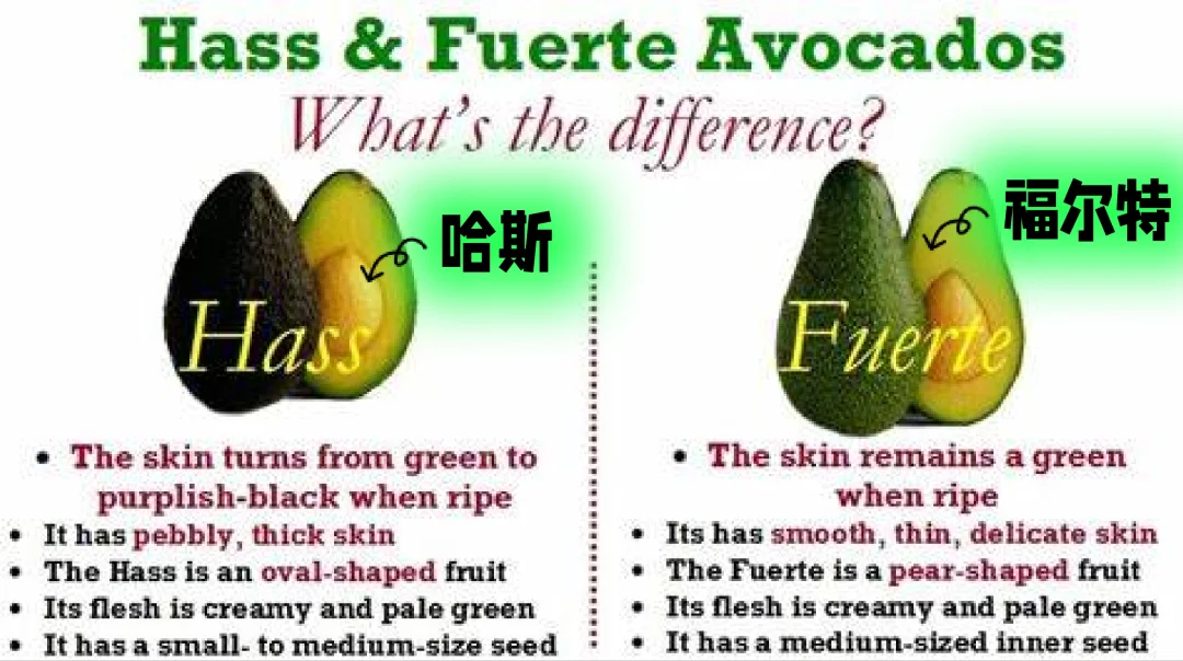 与其他品种牛油果光滑的绿色果皮不同,哈斯牛油果的果皮凹凸不平,成熟后由深绿色变为紫黑色。营养价值方面,哈斯牛油果的脂肪含量比其他品种高,这使得哈斯牛油果的口感更醇厚,质地更绵密丝滑,带有独特的坚果味。世界上80%的牛油果都是哈斯品种,其他品种只占剩余20%。