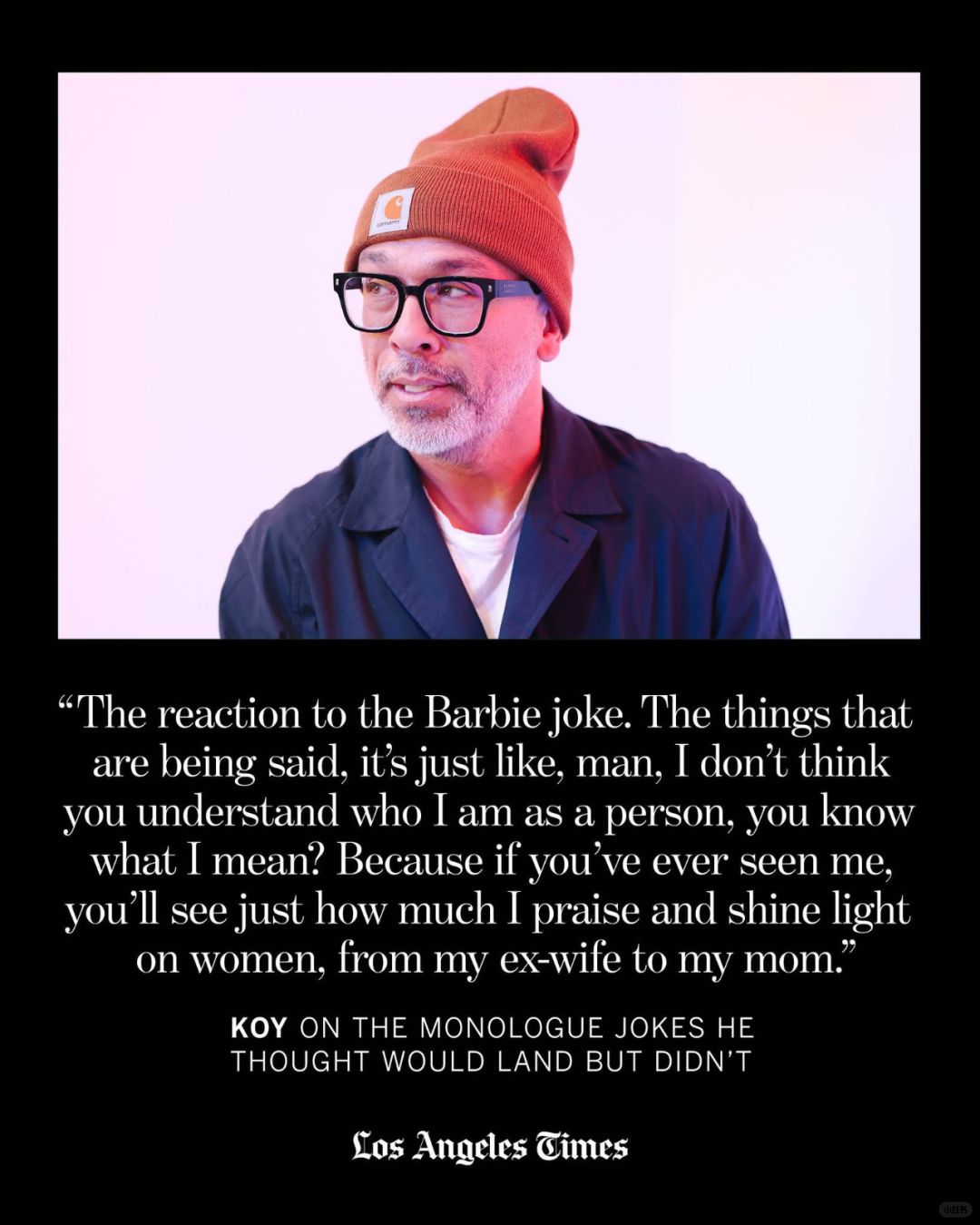 脱口秀明星/喜剧演员Jo Koy接受《洛杉矶时报》专访,他为自己在金球奖上「芭比大胸娃娃」的玩笑辩护: