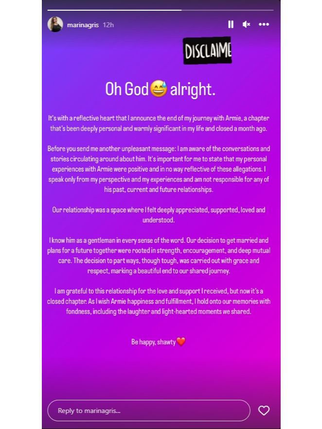 Marina Gris在ig上宣布:“我怀着一颗沉重的心宣布,我和艾米的旅程在一个月前结束了就结束了,这是我生命中深刻而温暖的一章。”