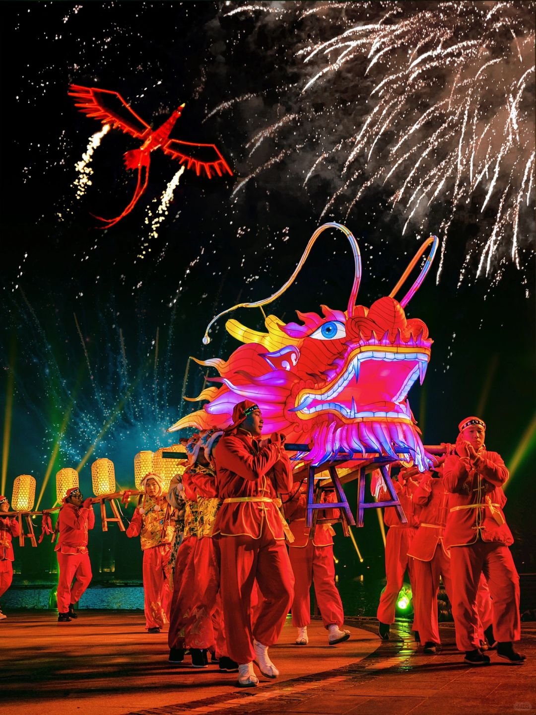天空有凤凰飞过,与长龙相对形成龙凤呈祥、吉祥圆满的画面~看完精彩演绎后可上台和龙凤共舞,还能近距离赏漫天烟花绽放,结束后还能自己点烟花棒放水灯~