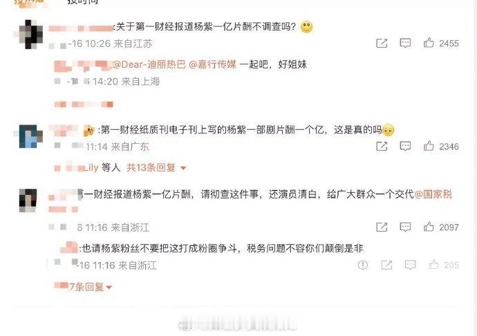 这???因为第一财经报道杨紫一部戏一个亿,迪丽热巴的粉丝去冲税务局官博了,要求查
