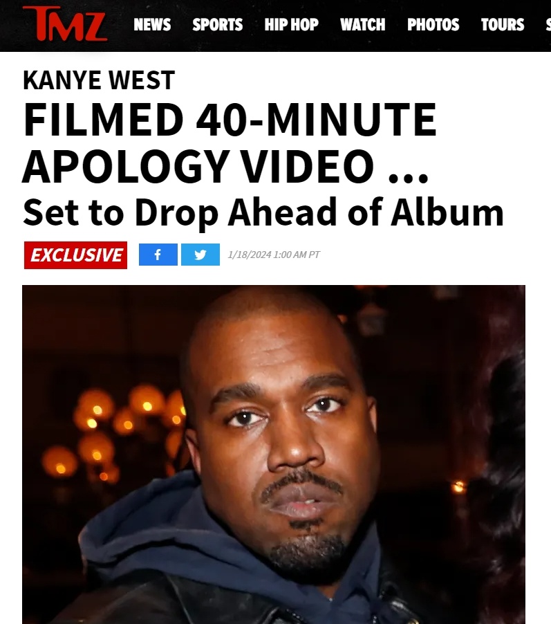 知情人士告诉TMZ:几周前,Kanye找来了几位摄像师,拍摄了一段冗长的道歉视频向犹太人道歉,这段视频长达40分钟,Kanye对着镜头侈侈不休。