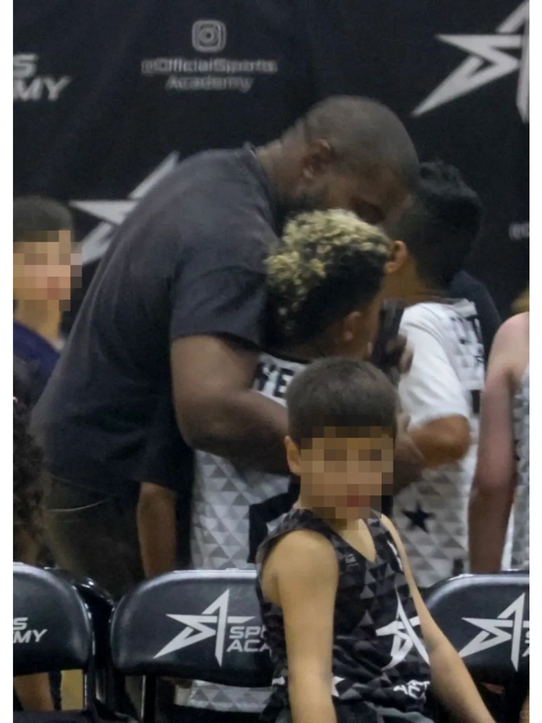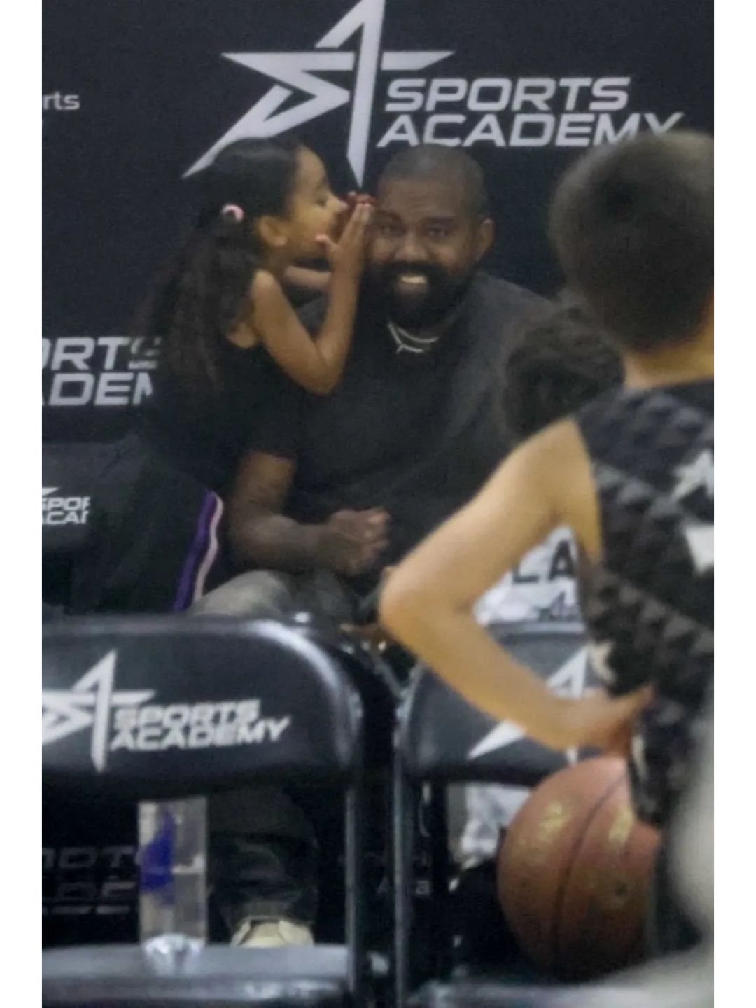 他们的另外2个孩子10岁的North和4岁的Psalm没有到场,但是小Chicago有跟着金姐一起到场支持哥哥Saint,期间Chicago主动跑去爸爸那边跟Kanye交头接耳。