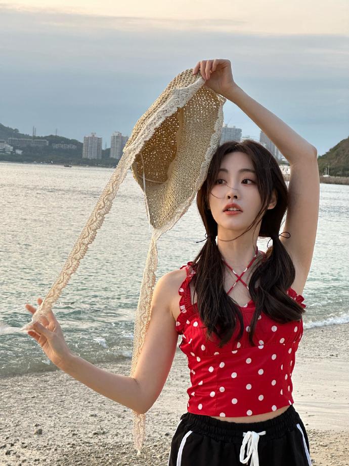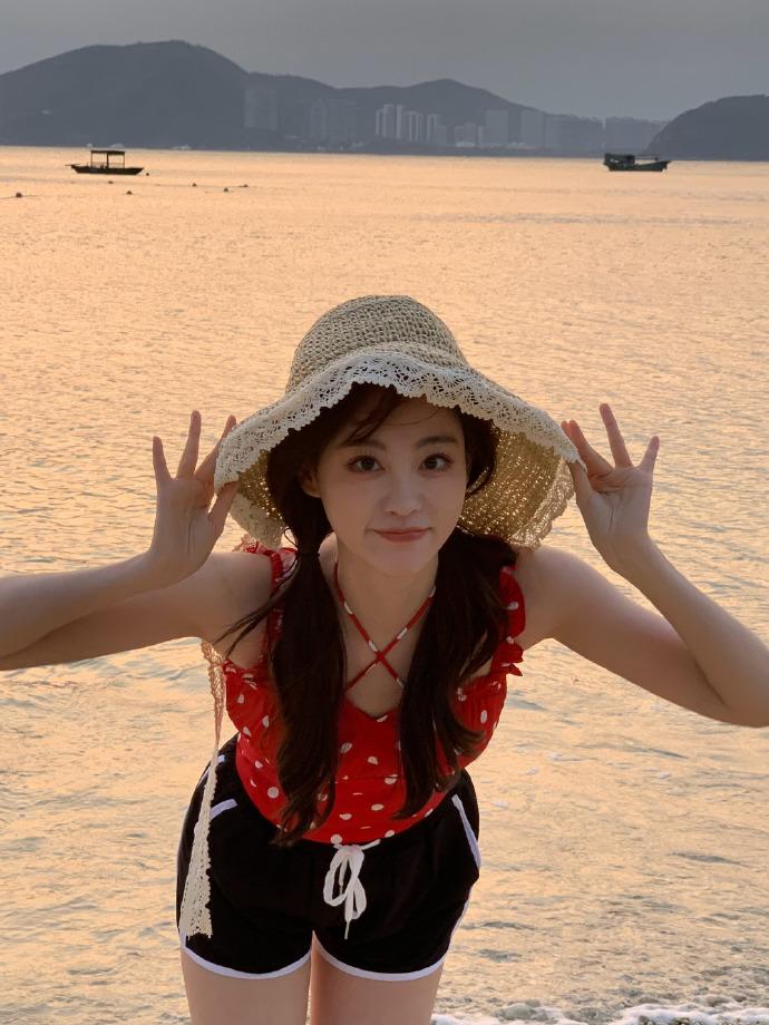 哇塞!祝绪丹在海边的草莓少女妆真是美到爆炸啦!元气满满,自由自在,美女玩得开心~
