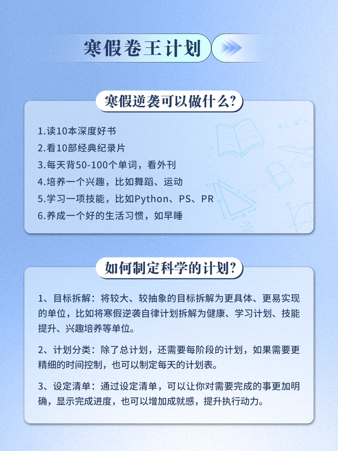 学生党都已经放寒假了吧~别人的假期,就是你的增值期[斜眼R] 一个假期很短,休息躺平玩手机就过去了[失望R] 一个假期也可以很长,能让我们实现自我提升[赞R] [种草R]读10本深度好书 [种草R]看10部经典纪录片 [种草R]每天背单词,学英语 [种草R]培养一个兴趣,比如舞蹈、运动 [种草R]学习一项技能,比如PS、PR [种草R]养成一个好的生活习惯 //追光的人 终会光芒万丈✨