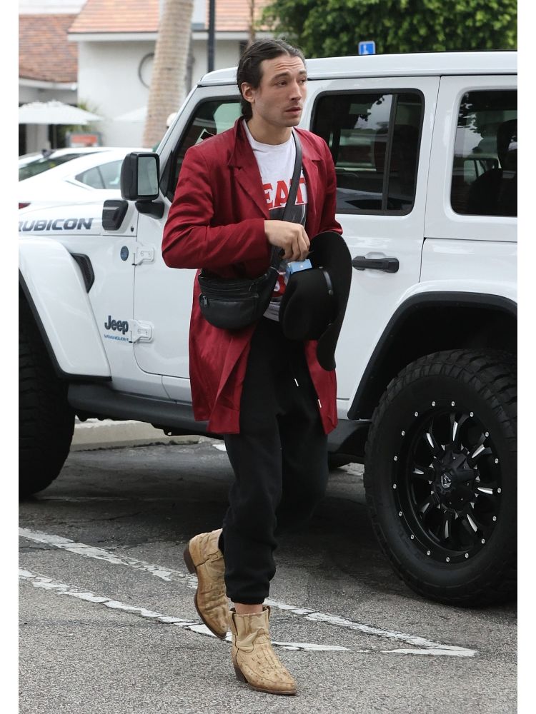 上周,饱受争议的《闪电侠》主演埃兹拉·米勒(Ezra Miller)极为罕见地回归地表,TA身着绯红色夹克、带有英日双语的T恤和景区售票阿姨和菜场大妈才会用的腰间挎包在比弗利山庄某商店买烟。