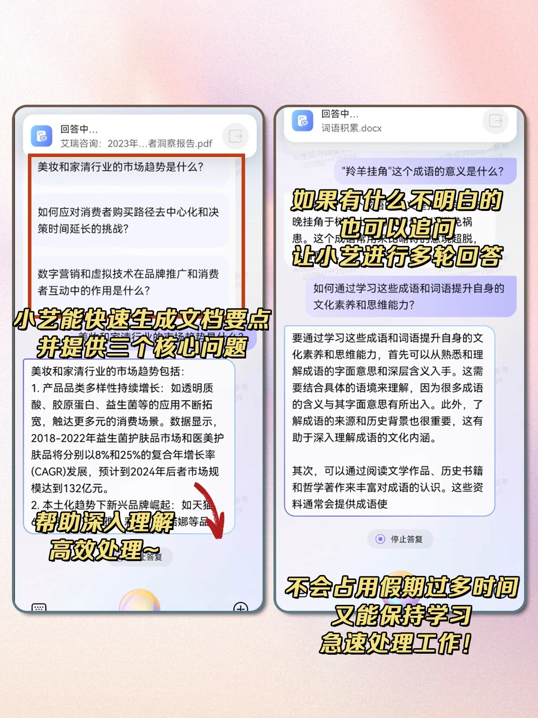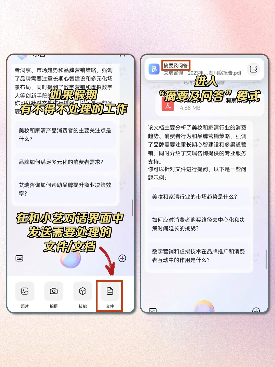 春节放假前,我们有时会需要阅读并理解大量文档,这时只需要唤醒小艺,在和小艺对话界面中,发送本地word/pdf给小艺,小艺就能快速生成文档要点,并提供三个核心问题给我们提问,帮助我们深入理解内容、高效处理工作,遇到不明白的也可以追问,让小艺进行多轮回答,分分钟处理完烦人工作,享受快乐假期~