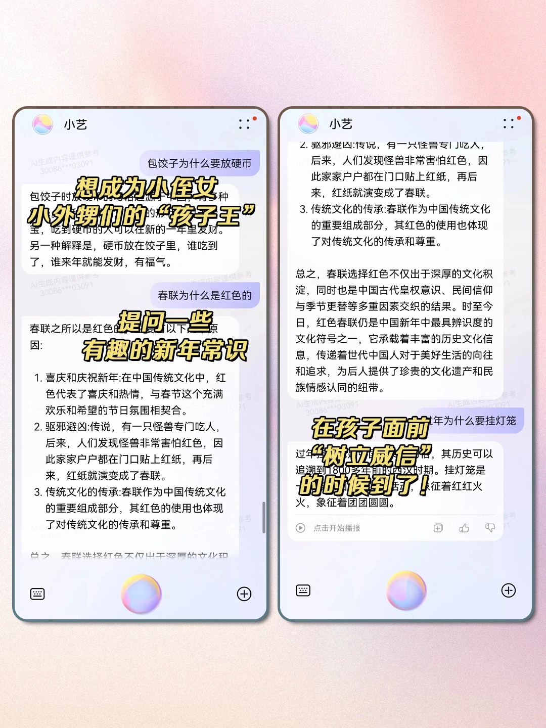 过年回家的时候,面对家中小朋友的各种奇奇怪怪的问题,例如“过年为什么要贴对联”“为什么过年要吃饺子”,直接唤起小艺问一嘴,小艺就能给出又快又准的答案