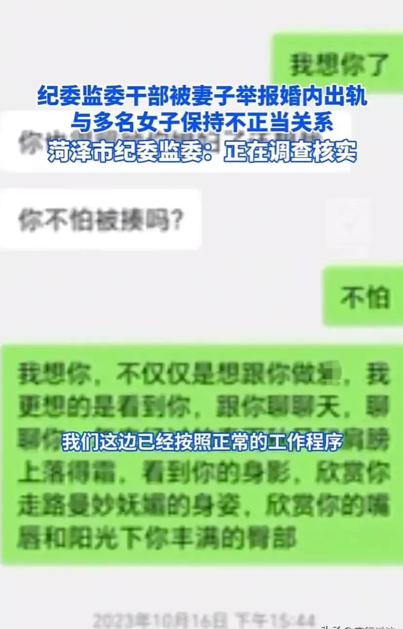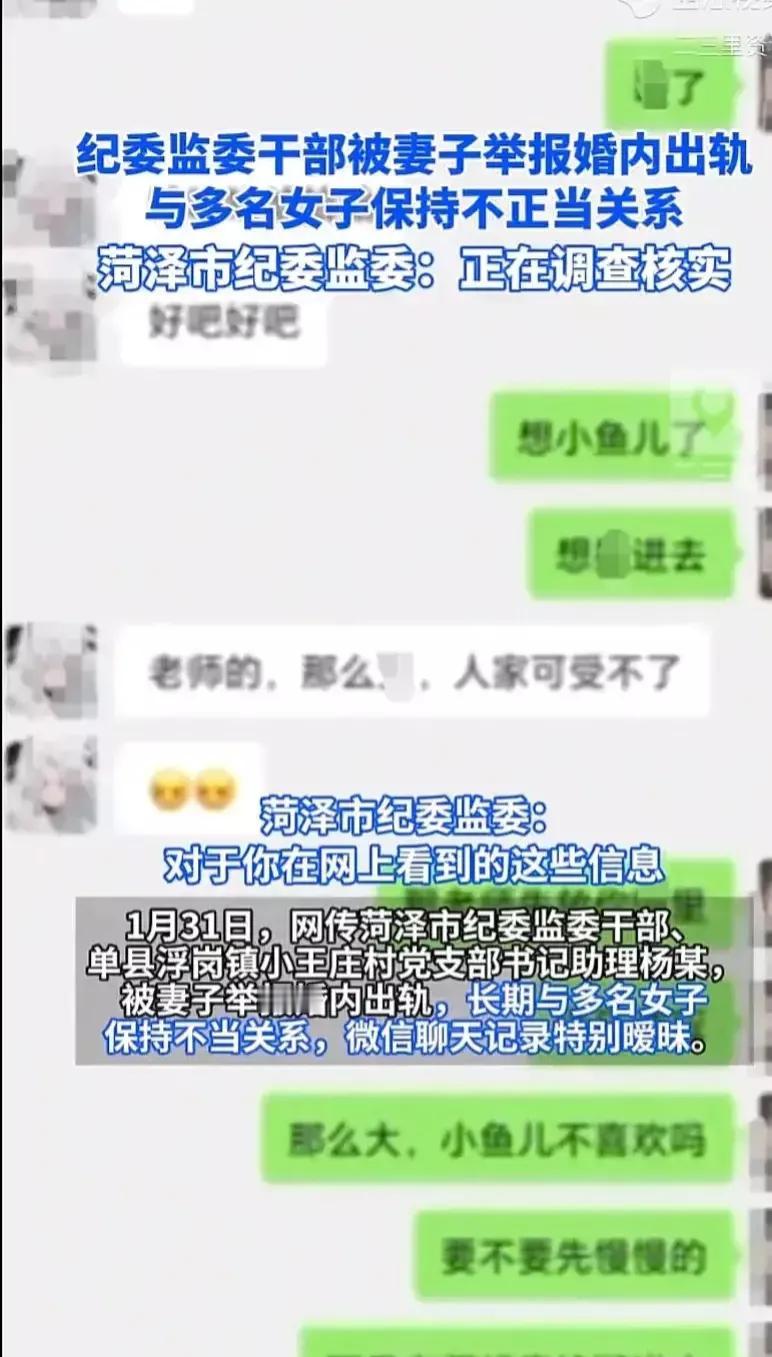 “太无耻了”,堂堂公职纪委干部居然出轨很多女性,而且还是在妻子怀孕时期,这名干部是多无耻多大胆,这色字头上一把刀,他不知道吗?他还是一名纪委干部,这更是知法犯法的行为。 近日 ,山东菏泽,一纪委干部在妻子怀孕期间出轨多名女性,被自己的妻子举报,聊天内容尺度之大,说话内容之无耻,从堂堂一名纪委干部嘴里说出来,很多人直呼:“太无耻了!” 目前,这个事情妻子举报,当地官方回复,正在按照正常工作程序,依规依法调查核实。 这个妻子也是忍无可忍才做出这大义灭亲的举动。 这个丈夫,伤了妻子的心太重了,在妻子怀孕期间,出轨多名女性,还和很多女性骚聊,这对每一个妻子来说,都是致命打击。 据悉,这男子是菏泽市纪委监委干部、单县浮岗镇小王庄村党支部书记助理杨某。 从网传聊天内容来看,男主可谓是“文采飞扬”,据说 这男子是中国人民大学毕业的高材生,怪不得文采斑斓,令许多女性神魂颠倒。 这些女子多达6人之多,很多都知道男主已婚,但好像还有一个要嫁给这个男主。 难道这女子不知道这男主已经结婚要生子吗? 难道不知道他的妻子已经怀孕吗?只能说这些女子和男子一样,都是一样的淫人才。 我估计,这么多女子都是被男主的文采所吸引,或者被男主的身份所折腰,或者被男主的容貌所吸引,或者被男主的金钱所勾引。 一个公职人员,还是纪委干部,做出如此令人大跌眼镜的事情来,真的不爱惜自己的羽毛啊! 想一想,现在考公务员多么的不容易。 自己的一手好牌,被自己打的稀巴烂。 这色字头上一把刀,普通人刀的是自己的家庭,会让自己的家庭解体。 公职人员的这个色刀,除了把自己的家庭支离破碎,还会把自己的公职毁于一旦。 就是裤裆里那点事,为什么要勒不紧裤腰带呢? 最后的结局就是,婚姻没有了,公职没有了。……。