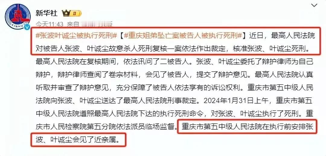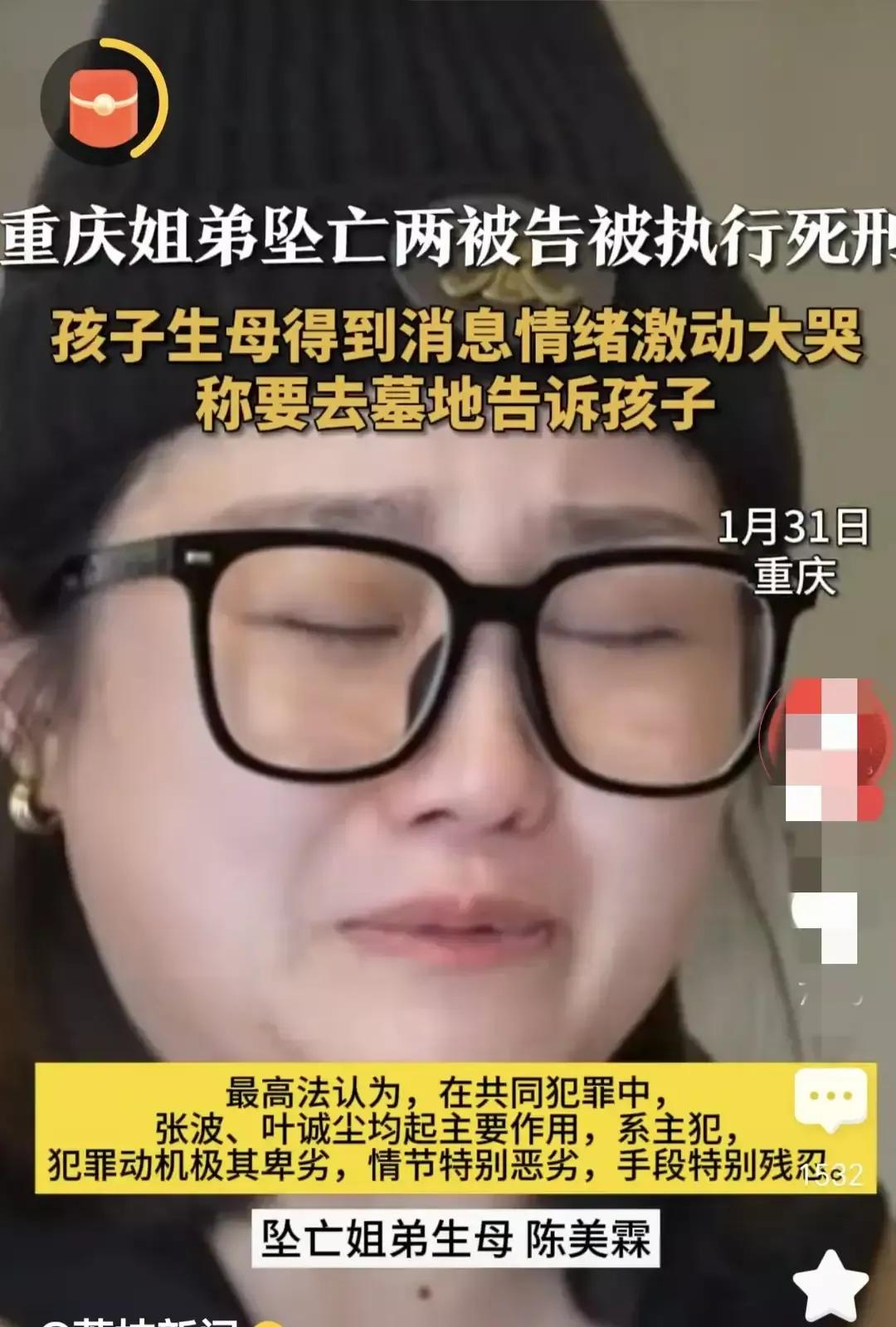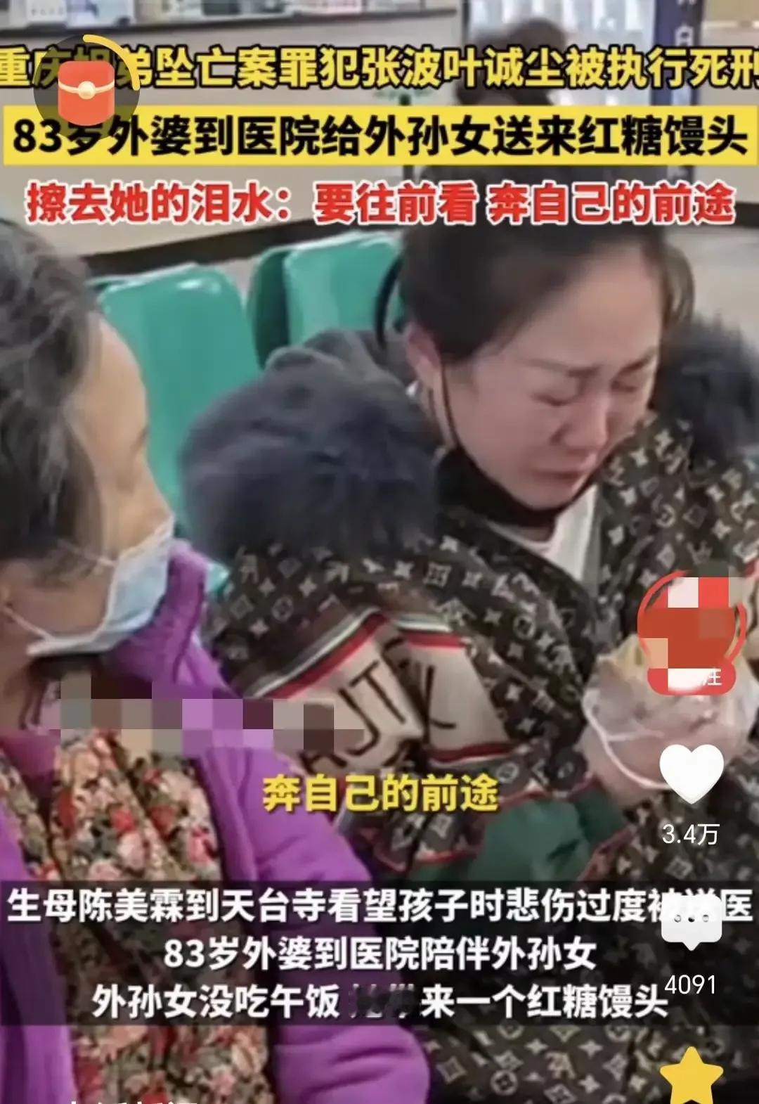 1月31日,震惊全国的姐弟坠亡案两罪犯张波、叶诚尘被执行死刑!张波和叶城尘发的爱情誓言已经生效,那就是不愿同年同月同日生,但愿同年同日死,可惜,这狠毒的人不配谈爱情,这两个人终于可以给那可怜的孩子赎罪去了。 没想到,这世间居然有如此禽兽父亲!虎毒不食子,可这人却亲手把自己的一双儿女狠心扔到了15楼下。 2020年11月2号,张波将自己的两个亲生孩子,两岁的女儿和一岁的儿子,直接抱着腿从15楼扔了下去! 他为了所谓的爱情,做出了人神公愤的事情,连做人的底线都没有了,这可是自己的亲生儿女。 1月31日,张波和情人叶城尘双双伏法死刑。 孩子的妈妈陈美霖听说他们俩已经执行死刑,她赶紧去寺庙把这个好消息告诉了自己的儿子女儿。 在寺庙里面,她激动,难过的都昏倒了。 亲人把她送到医院治疗。 陈美霖的外婆去看外孙女,给孙女带了俩红糖馒头。 陈美霖的外婆给陈美霖擦去她脸上的泪水,告诉陈美霖:一切都结束了,恶人得到了惩罚,你也要学会放下,要往前看,奔自己的前途。 是啊!陈美霖的外婆说的非常好:要往前看,奔自己的前途。 一个老人都知道的道理,这陈美霖肯定也知道。 加油!陈美霖!