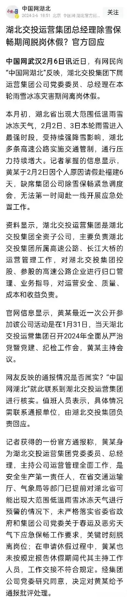 湖北高速因冻雨堵车的原因找到了! 湖北交投运营集团总经理黄某,2月2号请假6天去福建处理个人事务。临走前没有落实雨雪应急保畅工作,也没有做好交接班工作。导致出了事故无法赴一线开展应急处置工作。 怪不得湖北高速堵的一塌糊涂,周边省却基本正常通行。针对黄某上述不负责的行为,集团公司党委研究决定,对黄某给予通报批评处理。 官方过理结果出来之后,现在黄某已经返岗,并到达一线开展了相关的工作。