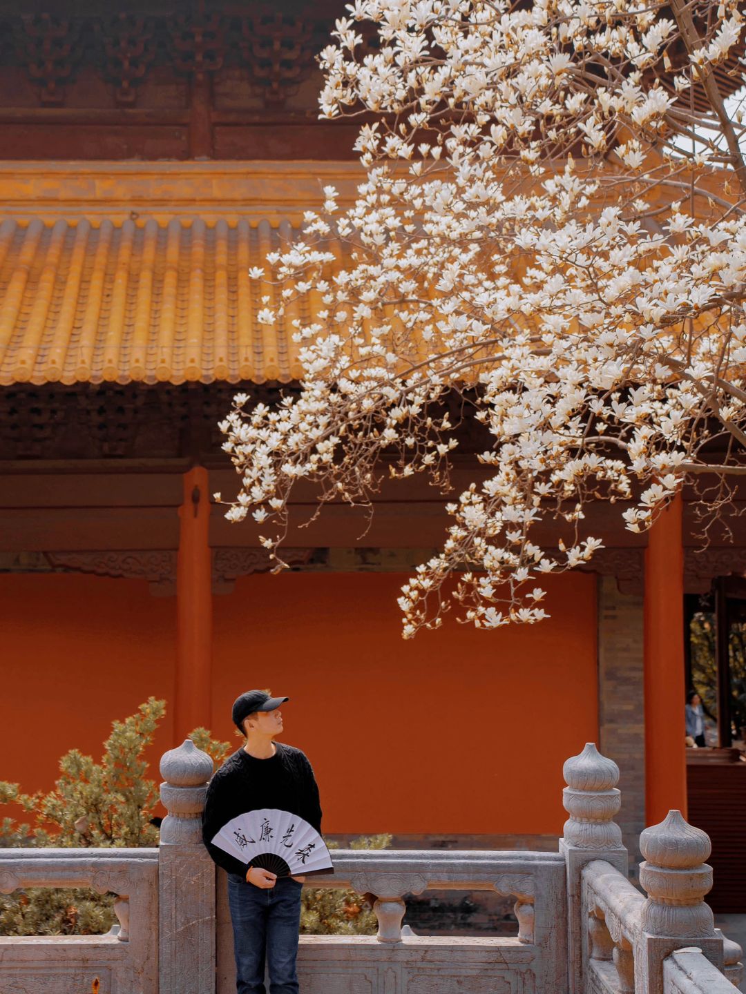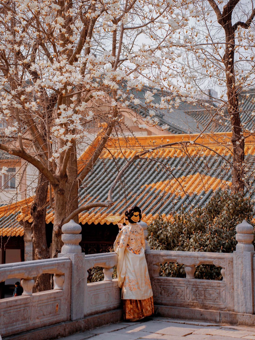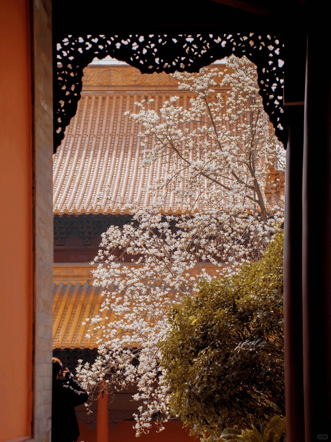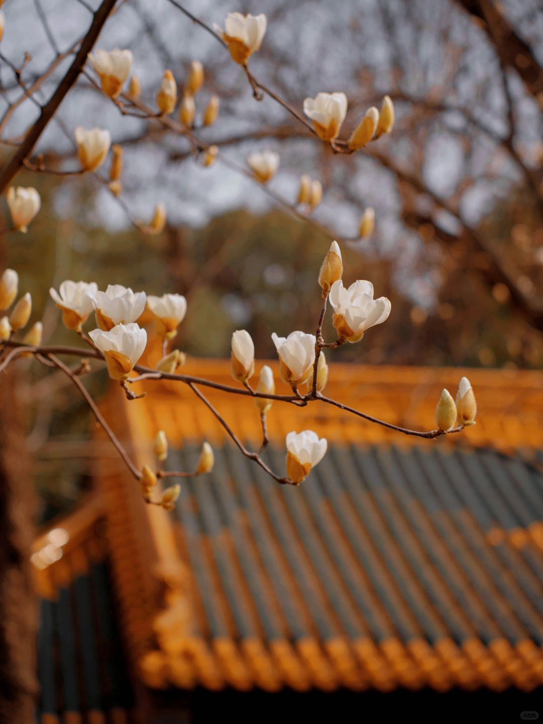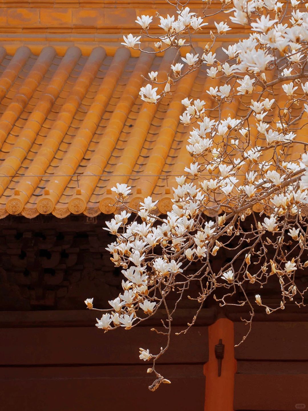 尊圣殿前有两株白玉兰,就在宫墙楼阁之间绽放,更显古色古香~