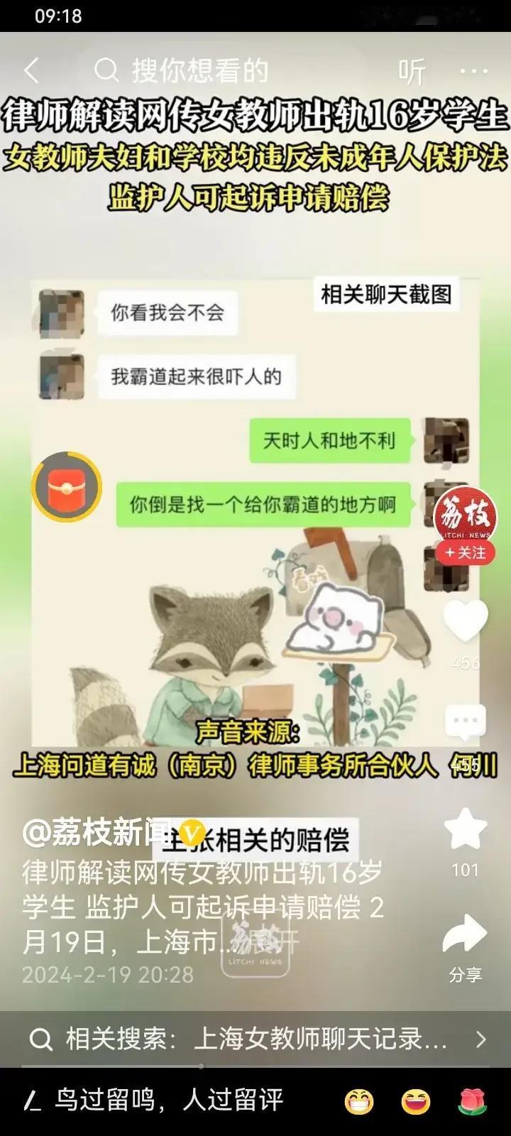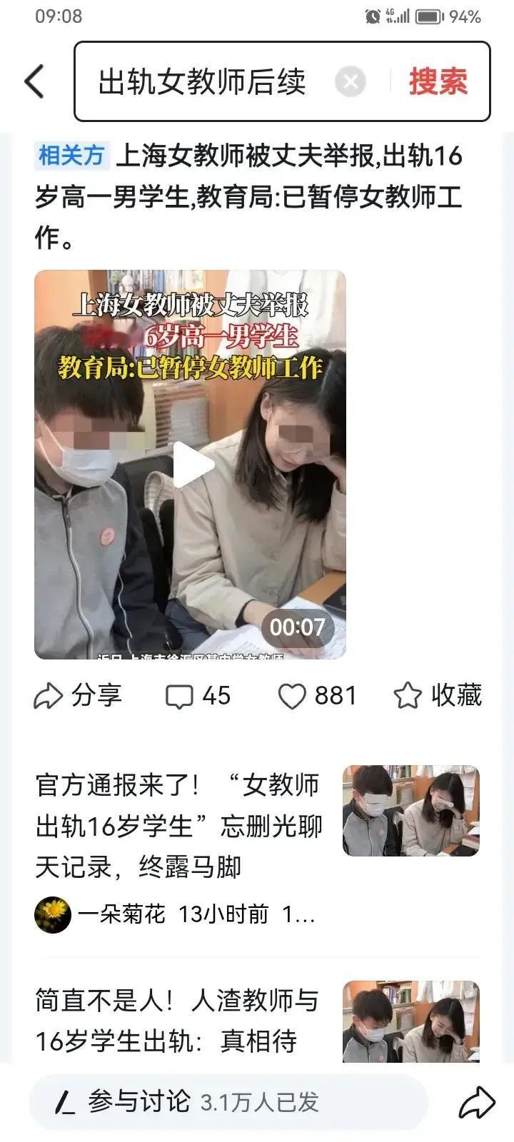 上海女老师和她的学生,是早熟的未成年遇上幼稚的成年人,擦出了不该有的火花! 这个火花擦出了不可饶恕的罪过,丈夫举报了,女老师彻底凉了,男学生的日子也不好过。 不知道这女老师心大不大?如果再这样继续下去,可能会出更大的事情。 女老师的老公全网举报,他们两个人已经不可能和好了。 这女老师已经成了全网名人,照片,聊天记录满天飞。 如果这个学校开除她,那就没有哪一个学校会敢聘用她。 女老师的教师生涯已经到头了。 如果将来再涉及到婚姻,那肯定正经家庭的男子不会接受这样的女子。 谁能保证她不会有第二次,第三次…。 她的一生会永远带着这个污点。 也许期待这个男孩子长大后会来娶自己的女老师。 就如法国的马卡龙和他的女老师。 但世界上只有一个马卡龙,只有一个马卡龙老师。 国情和国情不一样,人和人也不一样。, 他们俩,是早熟的未成年遇上幼稚的成年人,擦出了不该有的火花! 毕竟涉及未满18岁的一个未成年人,希望給两个人,特别这个未成年人的孩子的未来留条生路。 这个事情已经发生了,已经发展到这个地步,每一个当事人都要心里强大,希望能坚强活下去。