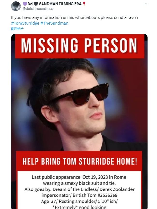 Tom Sturridge从去年10月出席罗马电影节之后就彻底人间蒸发,粉丝疑其已神隐。日前网上有心急的粉丝特意制作寻人启事【图2】,希望活要见人死要见尸。