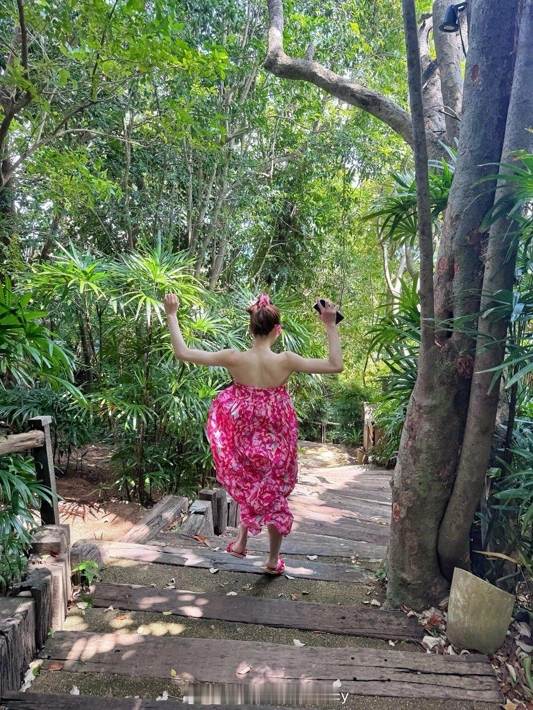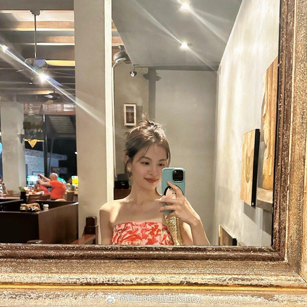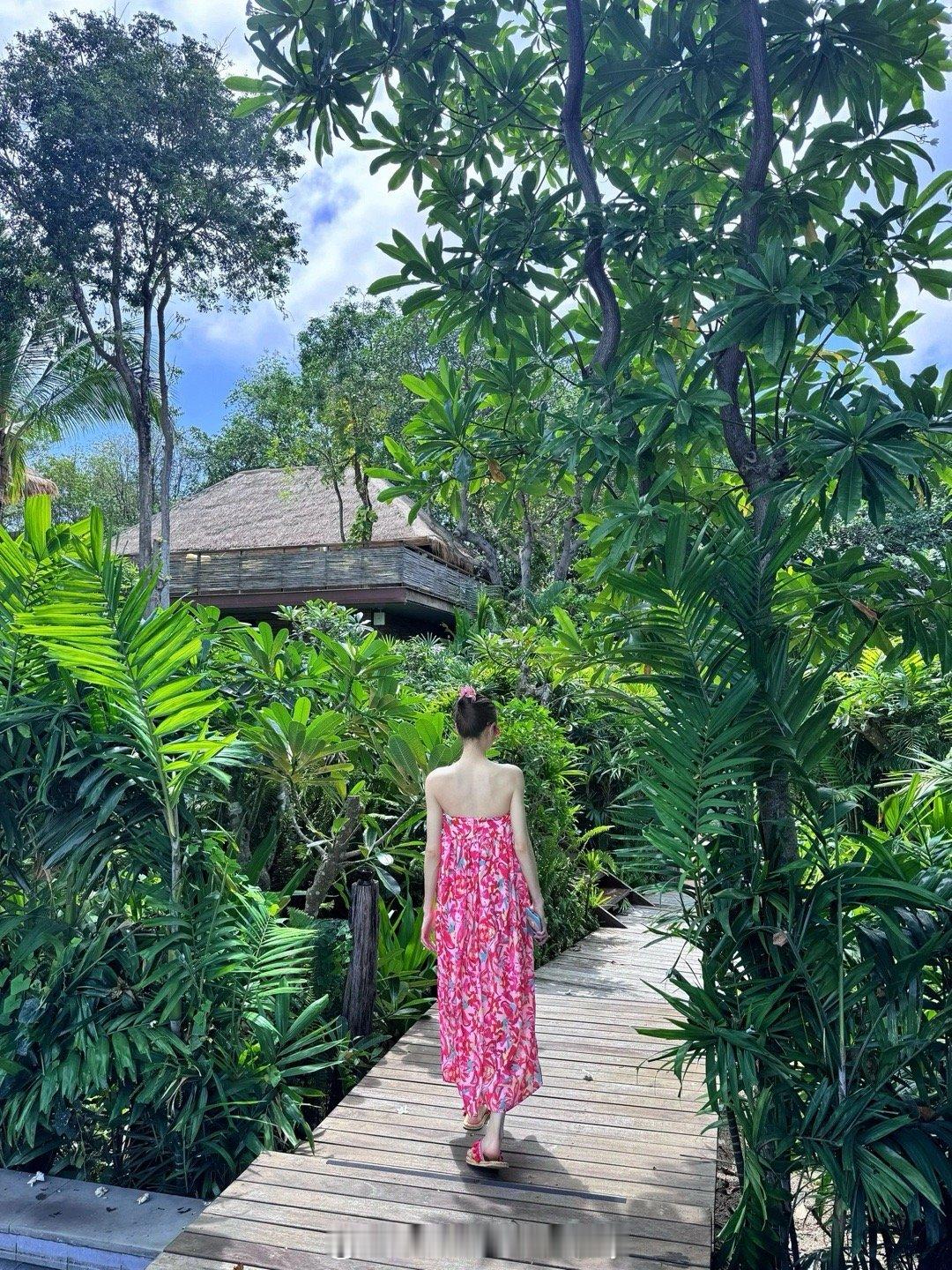 钟楚曦晒泰国度假美照,莓红色印花抹胸花苞连衣裙也穿出了风情万种!