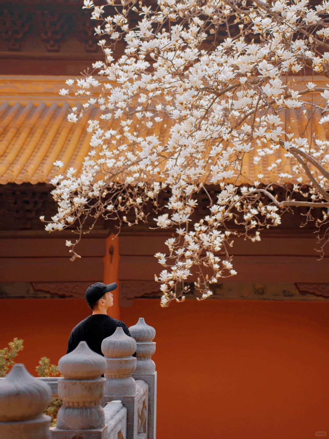 尊圣殿前的两株白玉兰在宫墙楼阁之间绽放,更显古色古香~