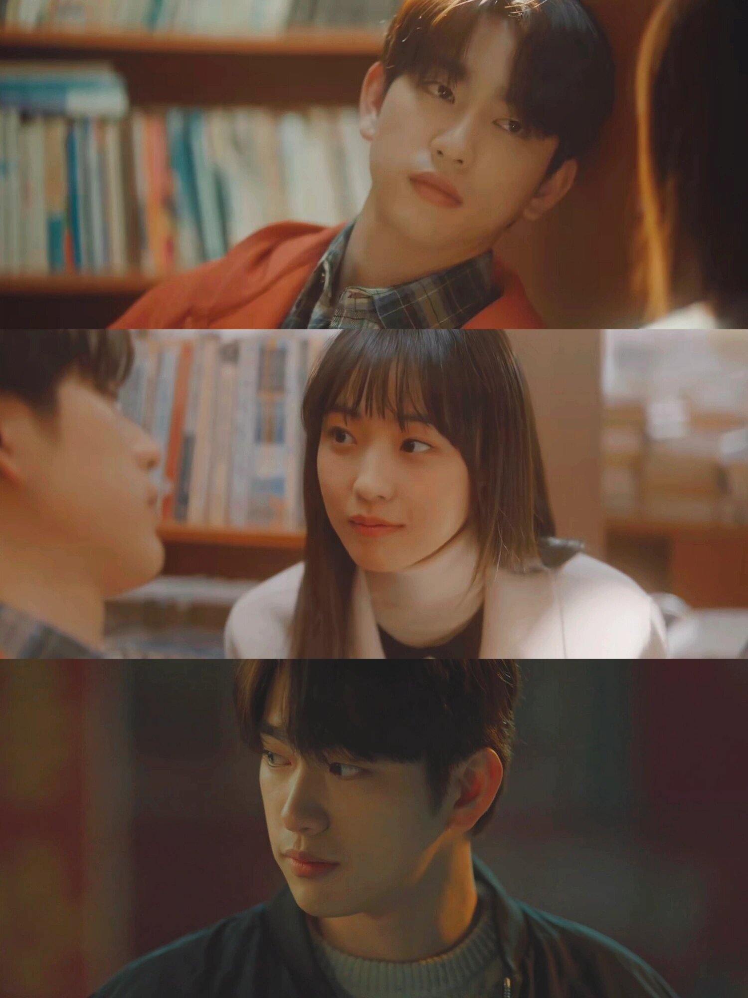 男主表面对女主爱答不理的,其实他非常关注女主的动向,女主跟着他去书店,差点被倒下的书砸中,他立马去保护她