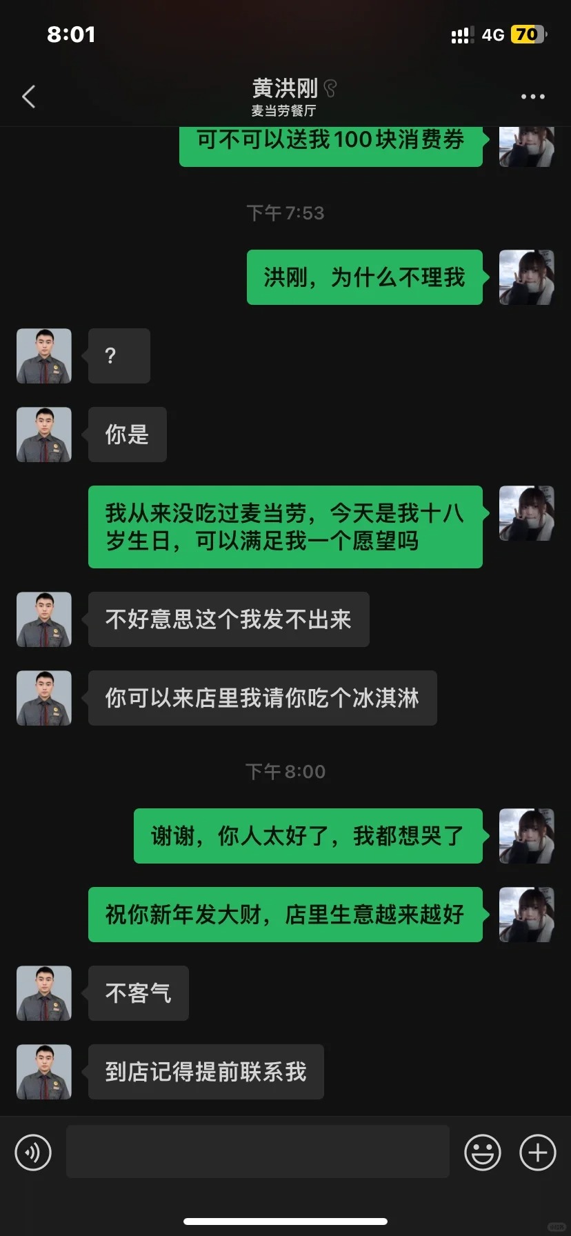 洪刚 对不起 我以为你们都是不会看消息的机器人,没想到还真的会回复,一句生日快乐让我愧疚一整个晚上,对不起,今天不是我的生日,我也早就过了十八岁了。洪刚,你不愧是能做到店长的人,以德服人,就冲着你今天这个冰淇淋,以后我不会再迈进开封菜半步,我的下半生都跟麦麦绑在一起了,麦门❤️