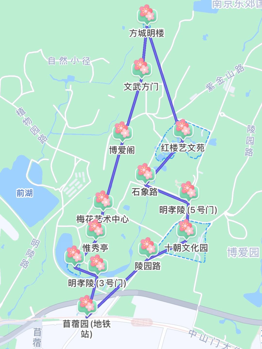 苜蓿园地铁站➠明孝陵3号门➠燕雀湖➠长生鹿苑➠文武方门➠明楼➠惟秀亭➠梅花艺术中心➠博爱阁➠红楼艺文苑➠石象路➠明孝陵5号门➠十朝历史文化园➠陵园路➠紫金坊➠苜蓿园地铁站