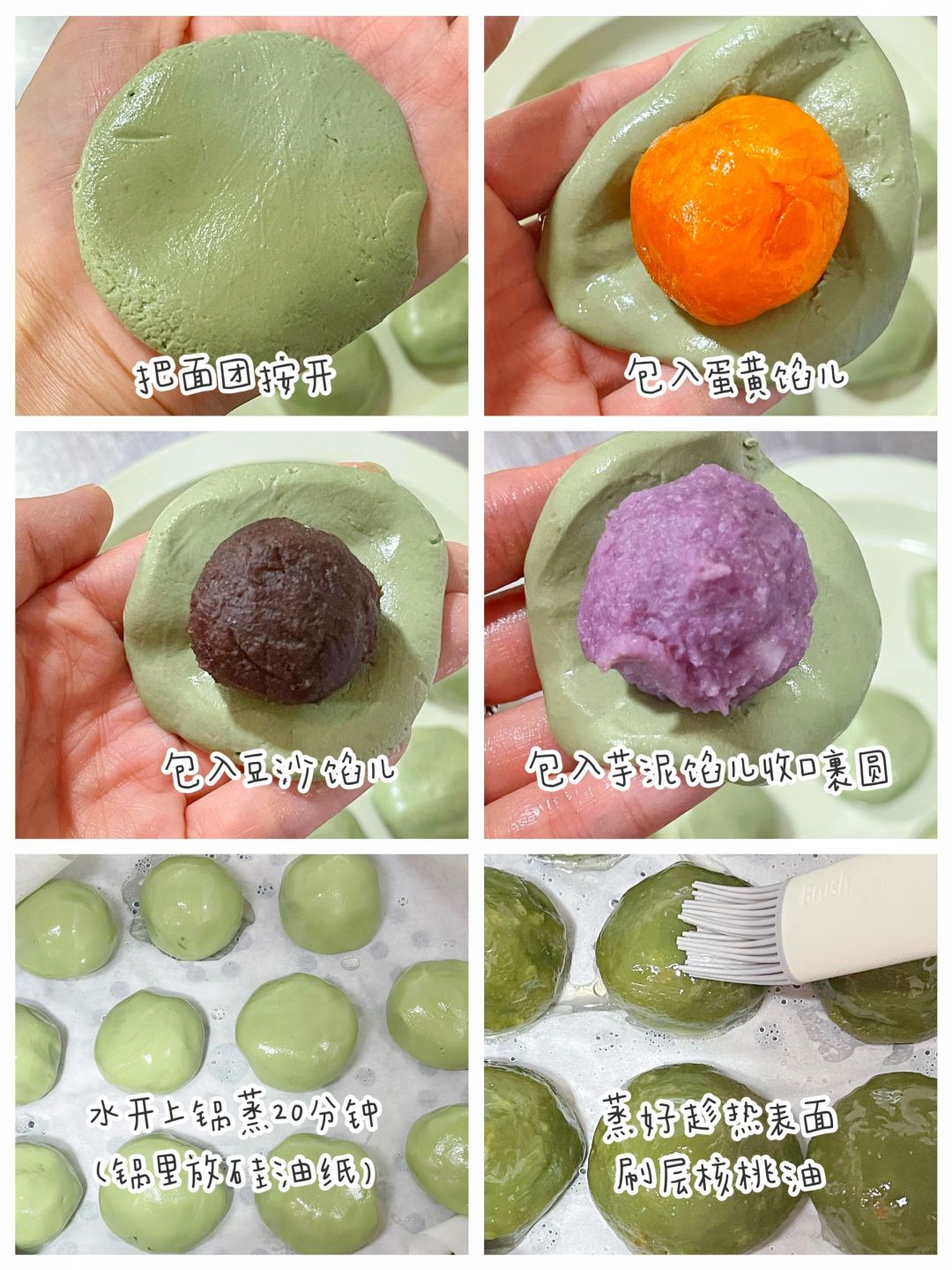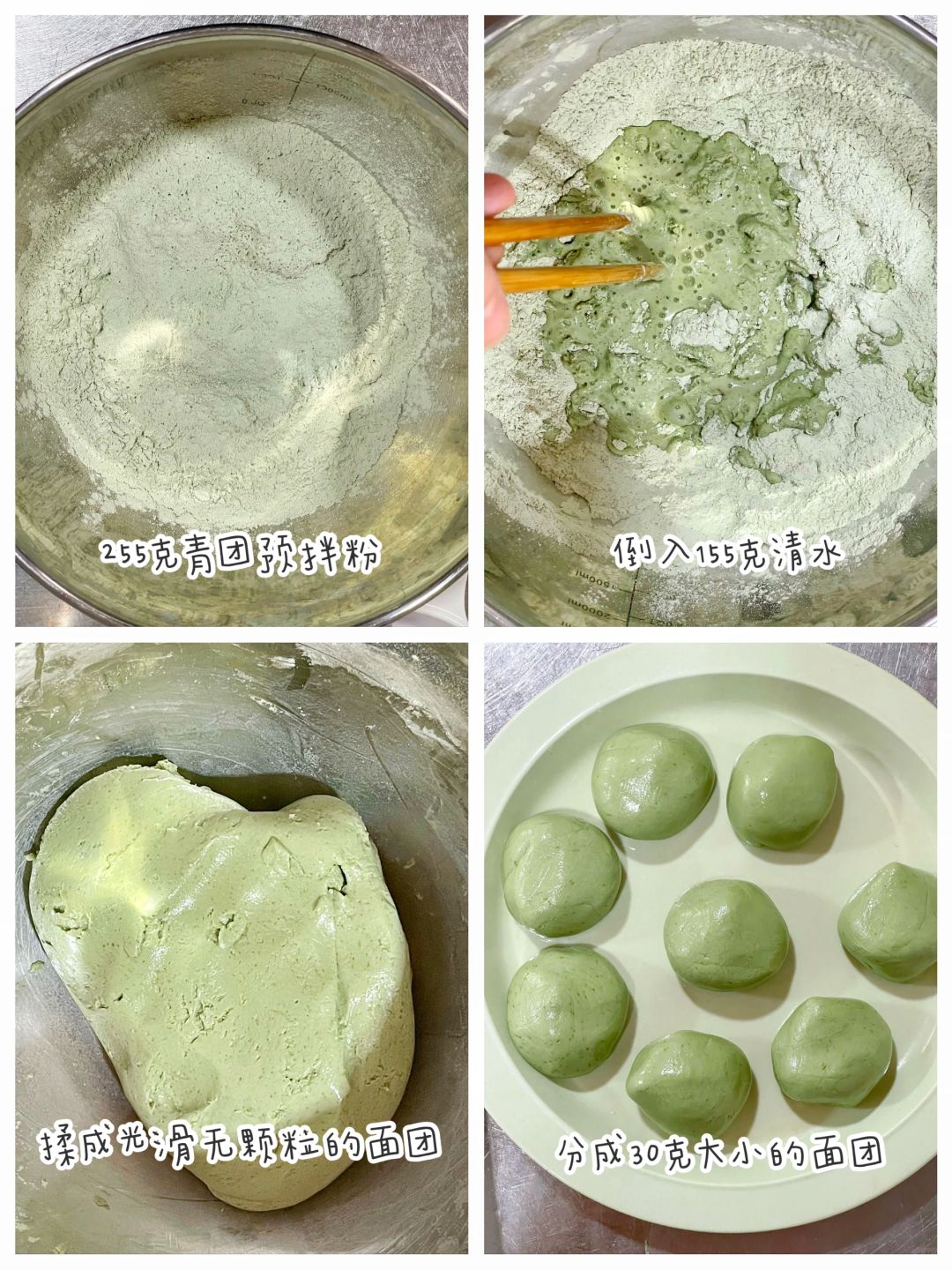 ✅255克青团预拌粉,倒入155克清水,搅匀,揉成光滑无颗粒的面团。分成30克一个的面团。按开依次裹上馅儿料,收口裹圆。水开上锅蒸15分钟,蒸好后表面刷上核桃油即可。