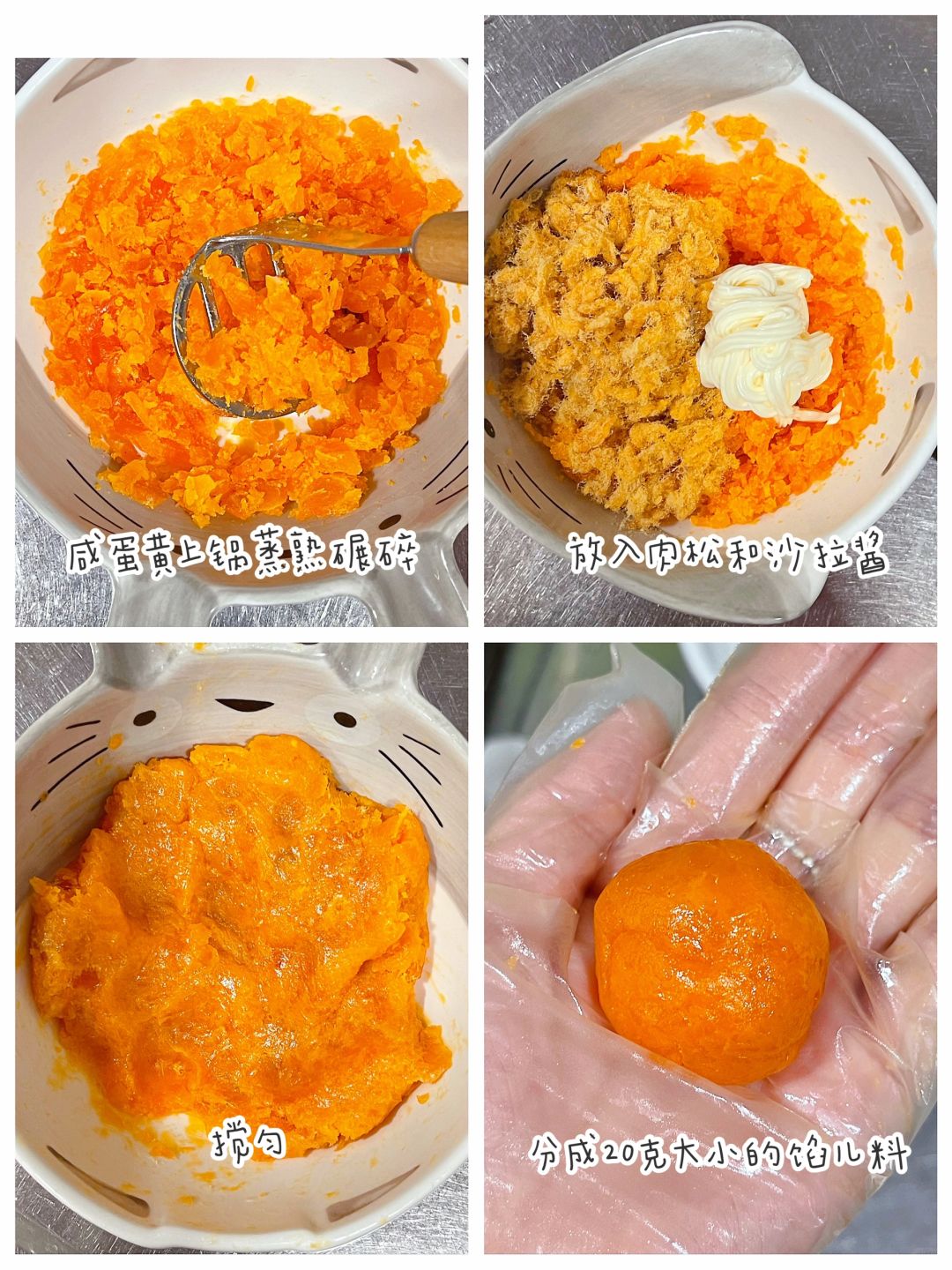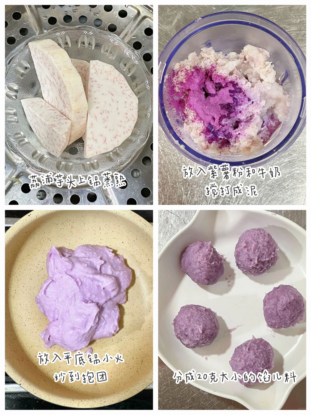 🔹荔浦芋头上锅蒸熟,倒入牛奶和紫薯粉放料理机打成泥。倒入平底锅小火炒到。揉成20克一个的馅儿团。咸蛋黄肉松馅:咸蛋黄80克、肉松50克、沙拉酱50克。蛋黄上锅蒸熟碾碎。倒入肉松和沙拉酱搅匀。揉成20克一个的馅儿料。