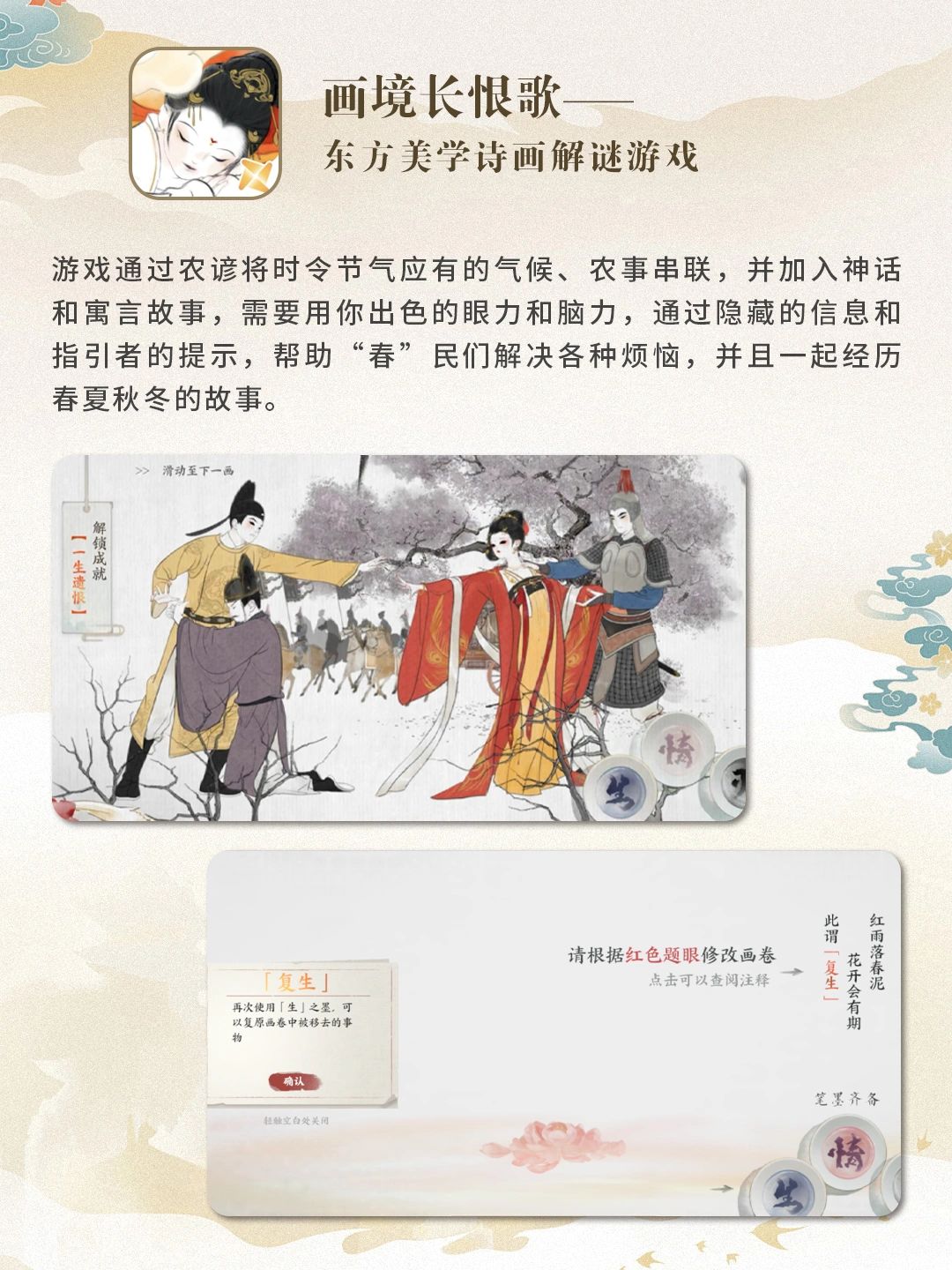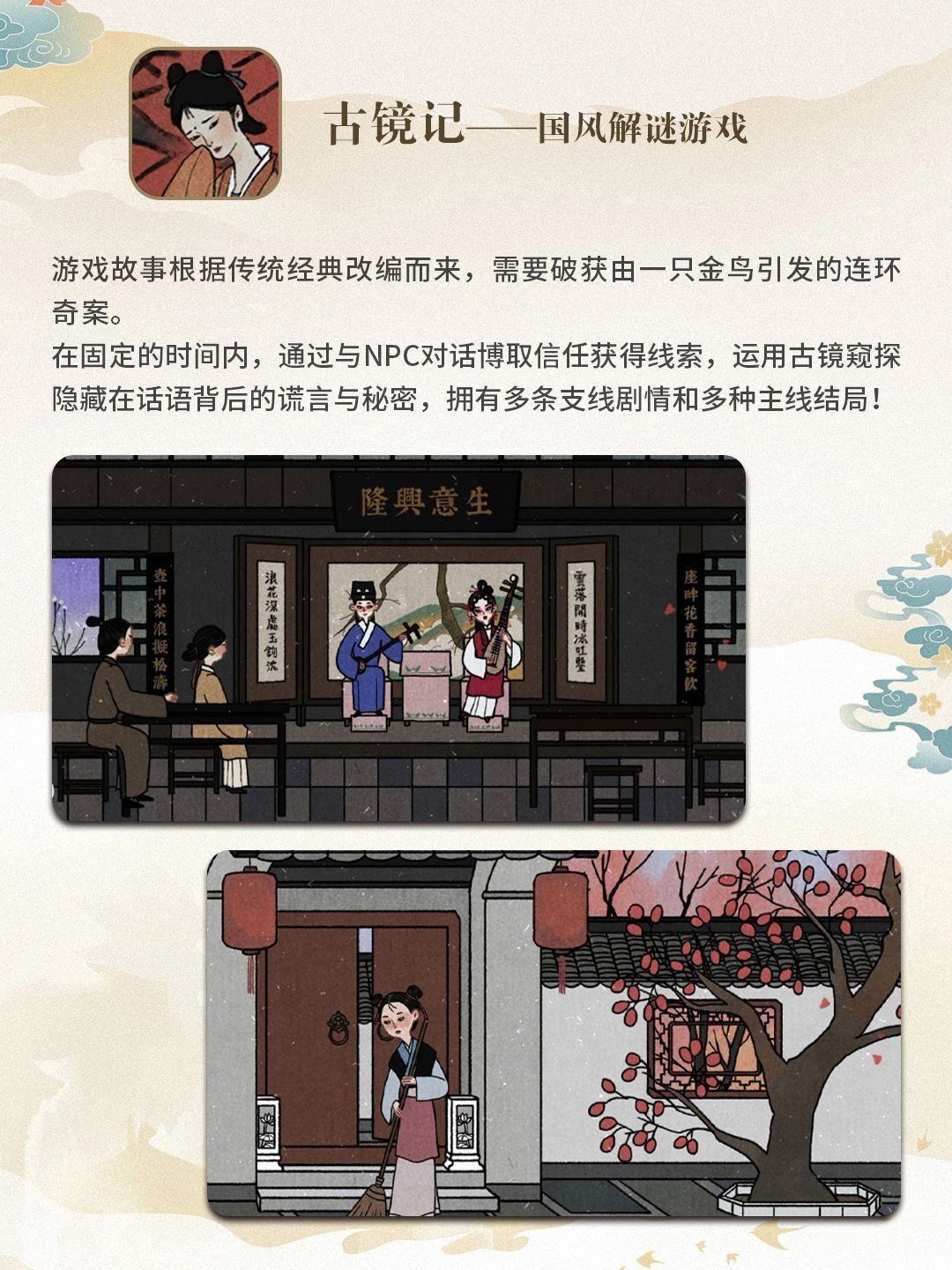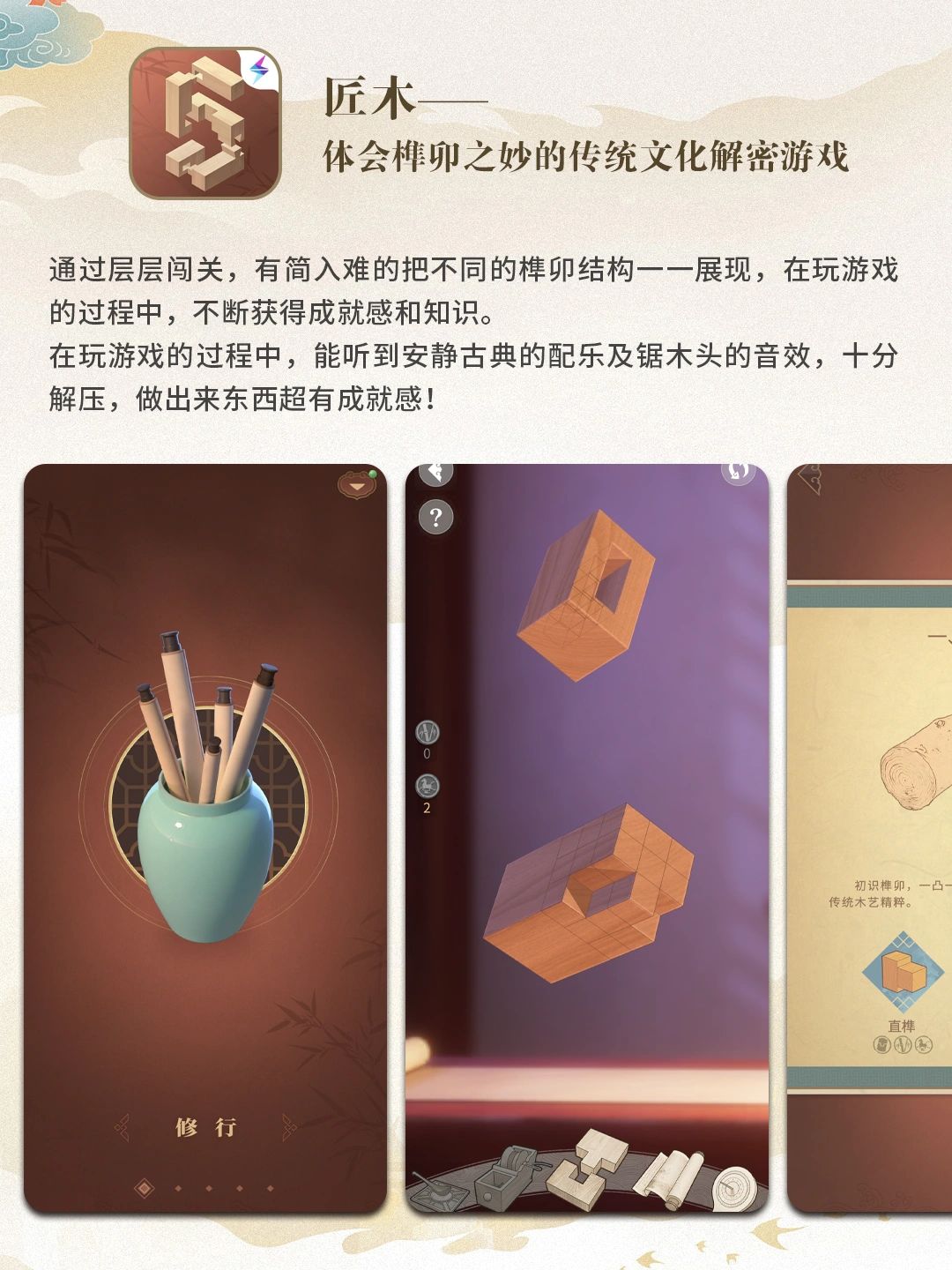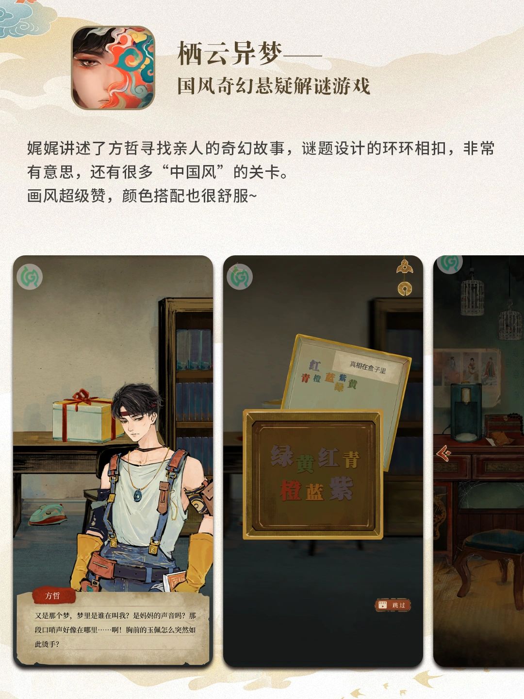 一眼惊艳的古风解谜游戏谁不爱啊[萌萌哒R] 古风解谜游戏,画风绝美,还有很多中国传统文化在其中~更适合中国宝宝体质[黄金薯R] [烟花R]栖云异梦-国风奇幻悬疑解谜游戏 [烟花R]古镜记-国风解谜游戏 [烟花R]山河旅探-国风横轴本格推理探案游戏 [烟花R]四季之春-二十四节气为内核的寻物解谜游戏 [烟花R]画境长恨歌-东方美学诗画解谜游戏 [烟花R]匠木-体会榫卯之妙的传统文化解密游戏 [星R]一微尘里三千界 半刹那间八万春[樱花R]