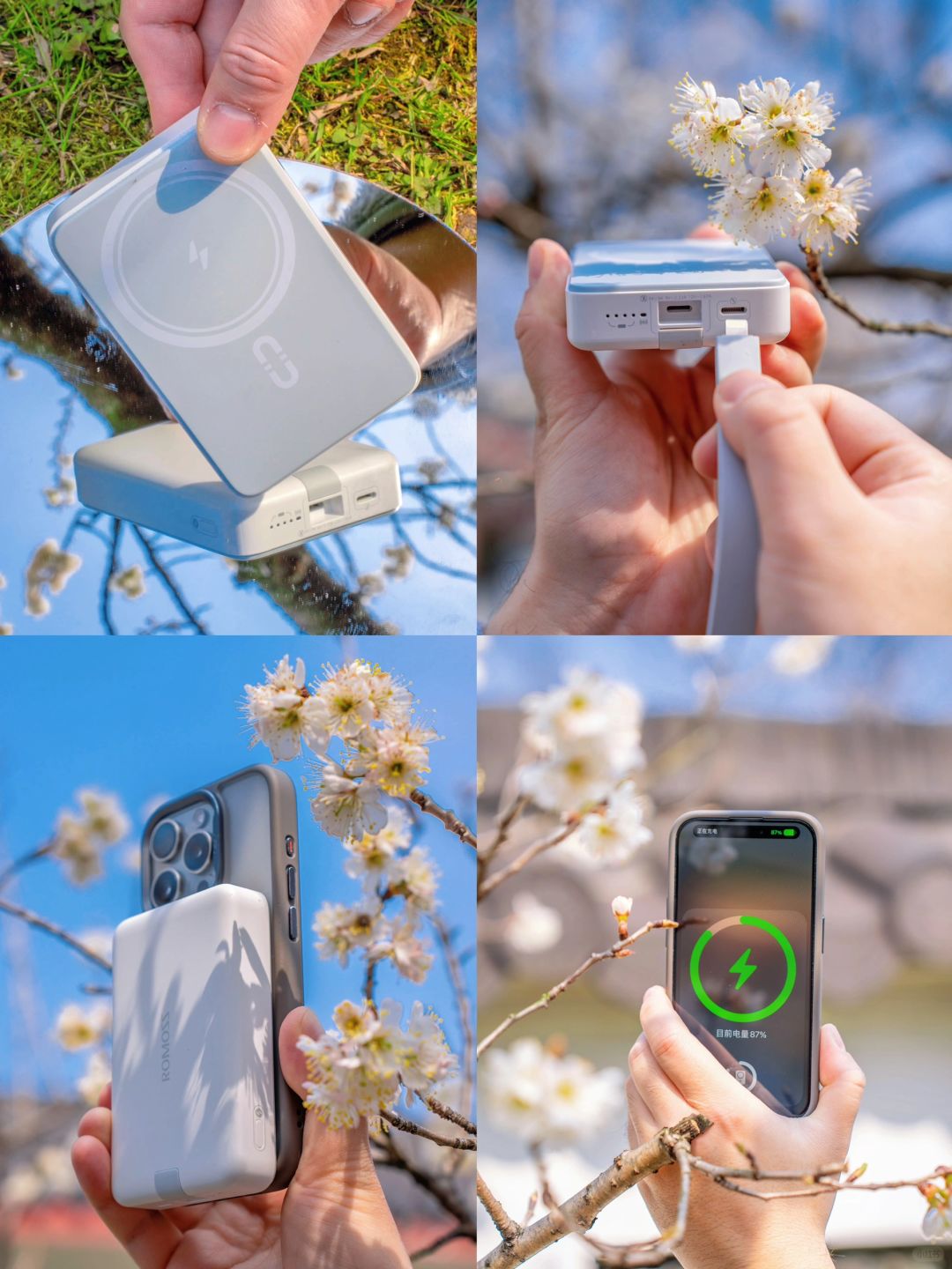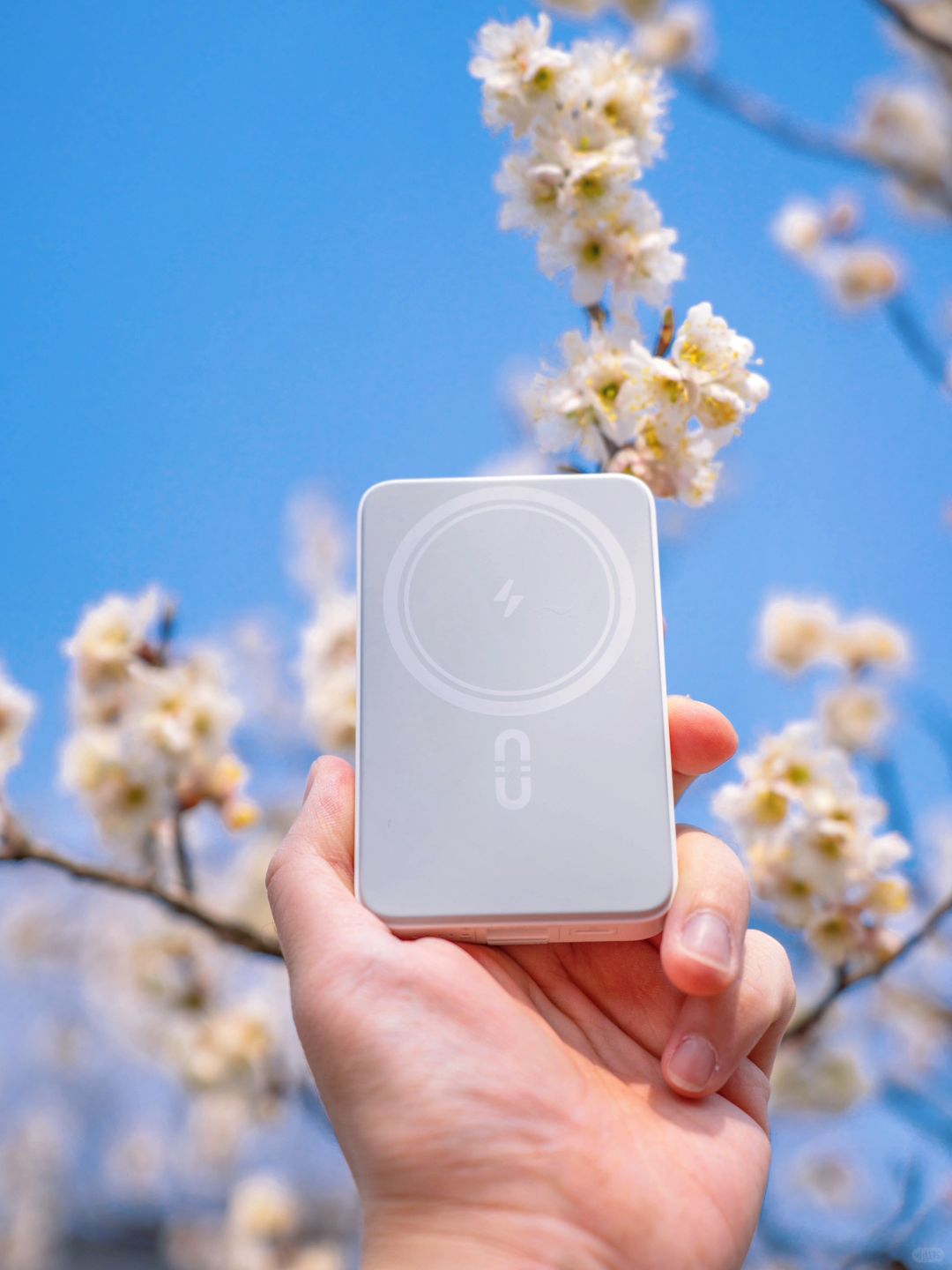 我带的一直就是【罗马仕磁吸充电宝】,这个春天好喜欢白色,跟粉白色的樱桃花好配,好用也好拍~