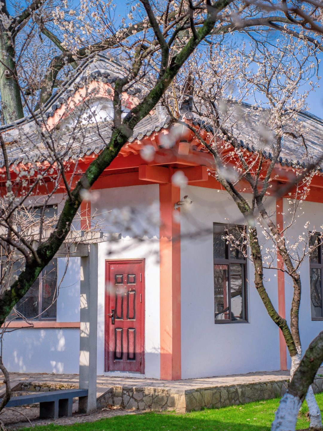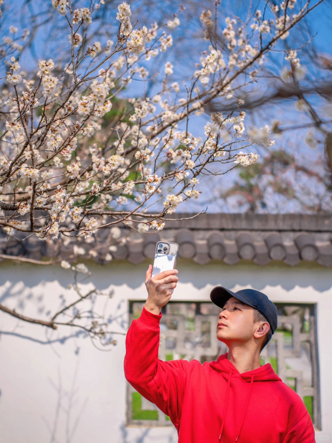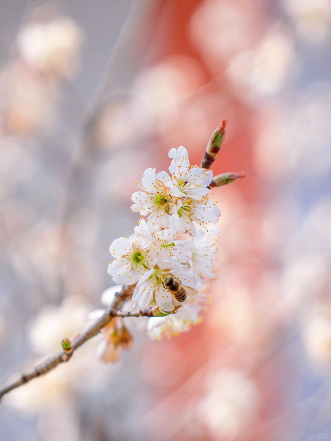 这次发现位于樱桃园内的樱桃花已悄然开了,粉白色的樱桃花挂满了枝头,搭配红白色的唐风建筑真的好出片~