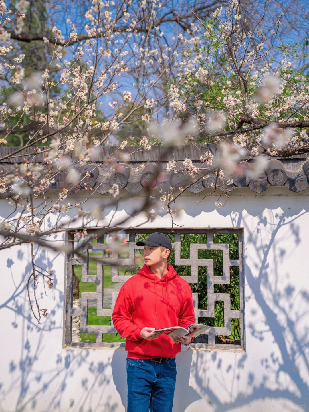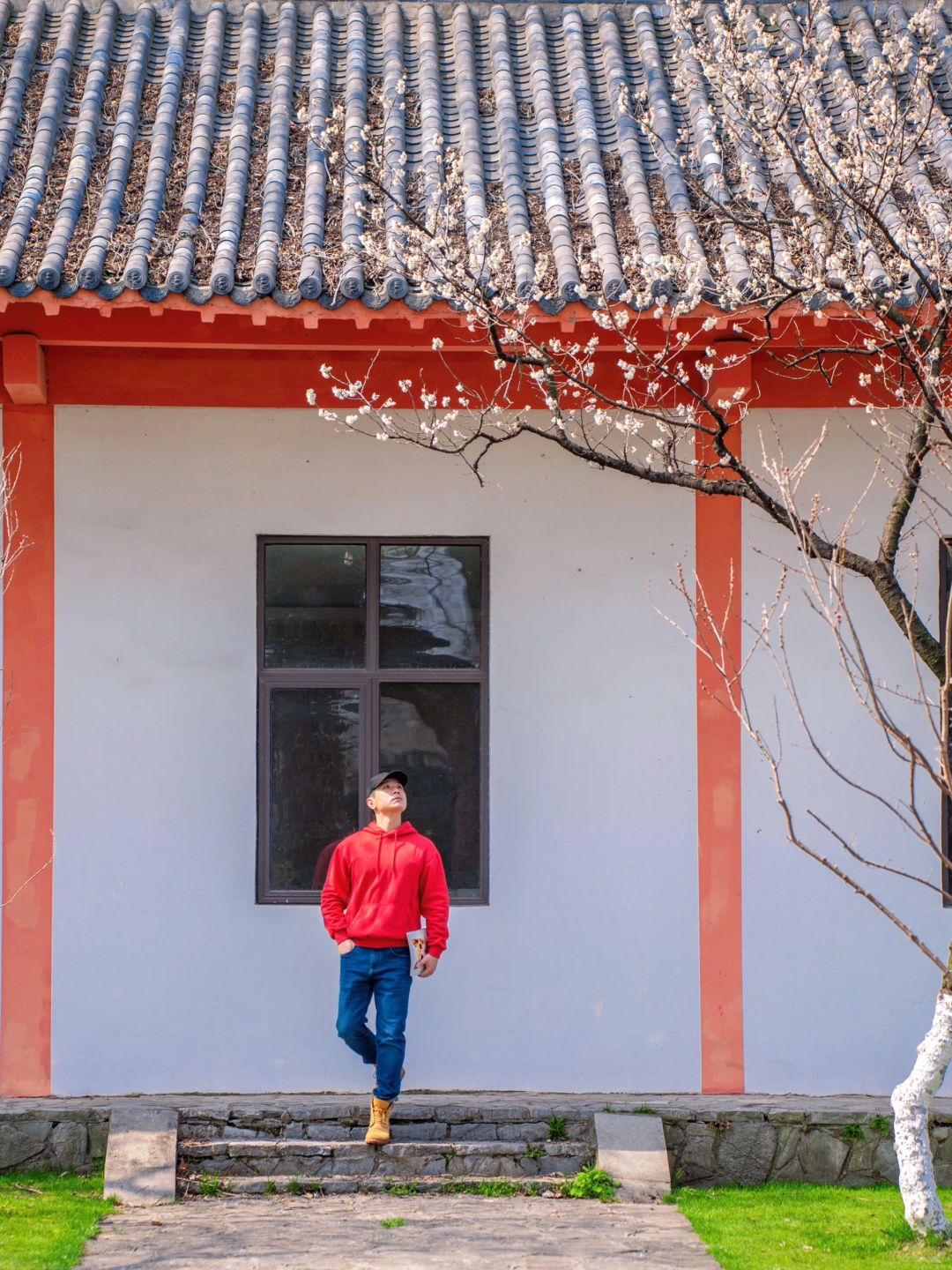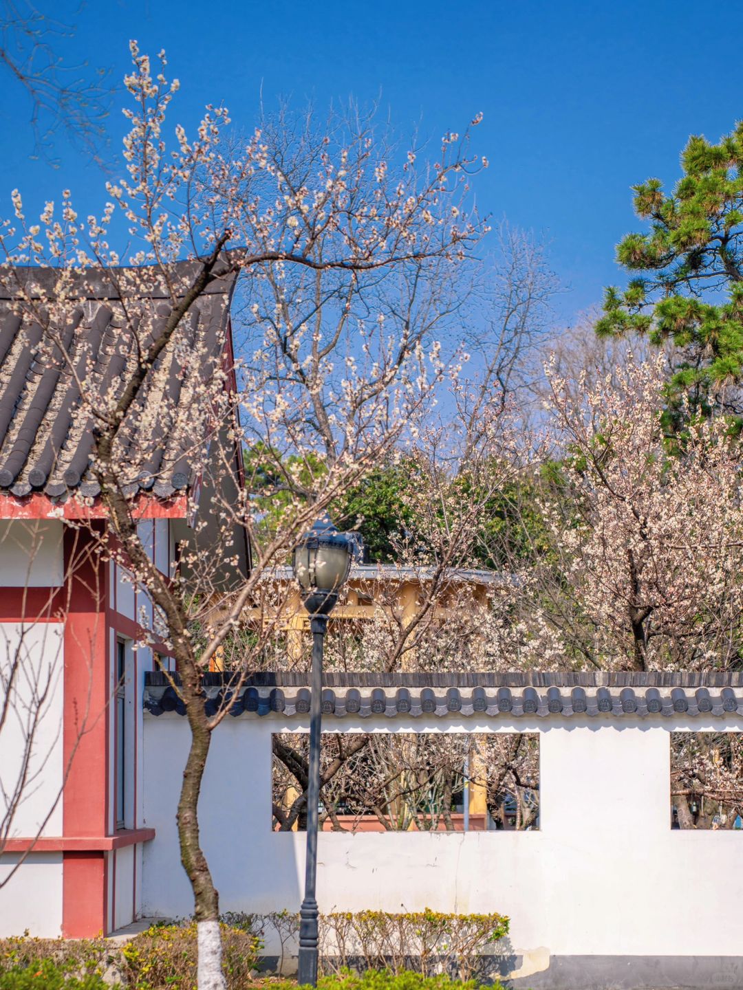 这次发现位于樱桃园内的樱桃花已悄然开了,粉白色的樱桃花挂满了枝头,搭配红白色的唐风建筑真的好出片~