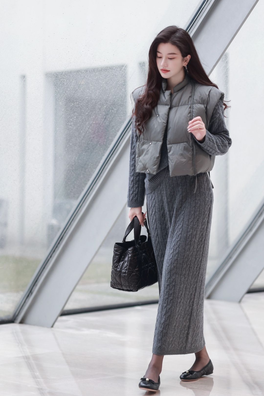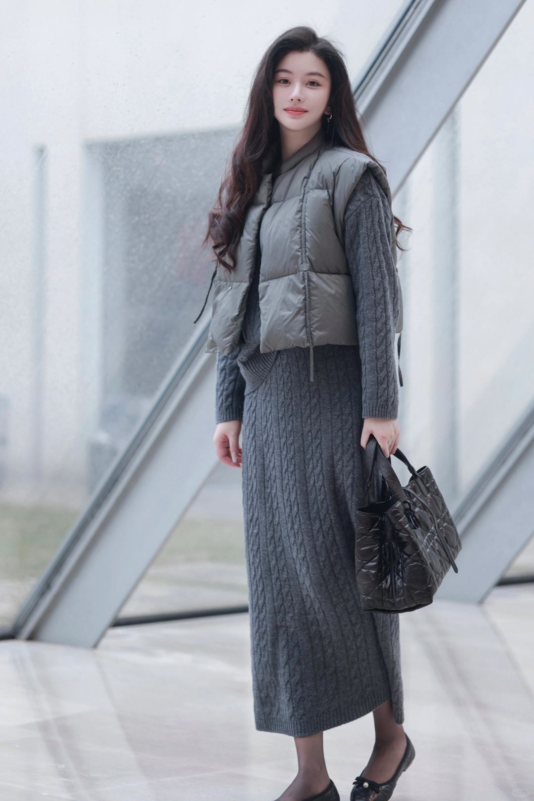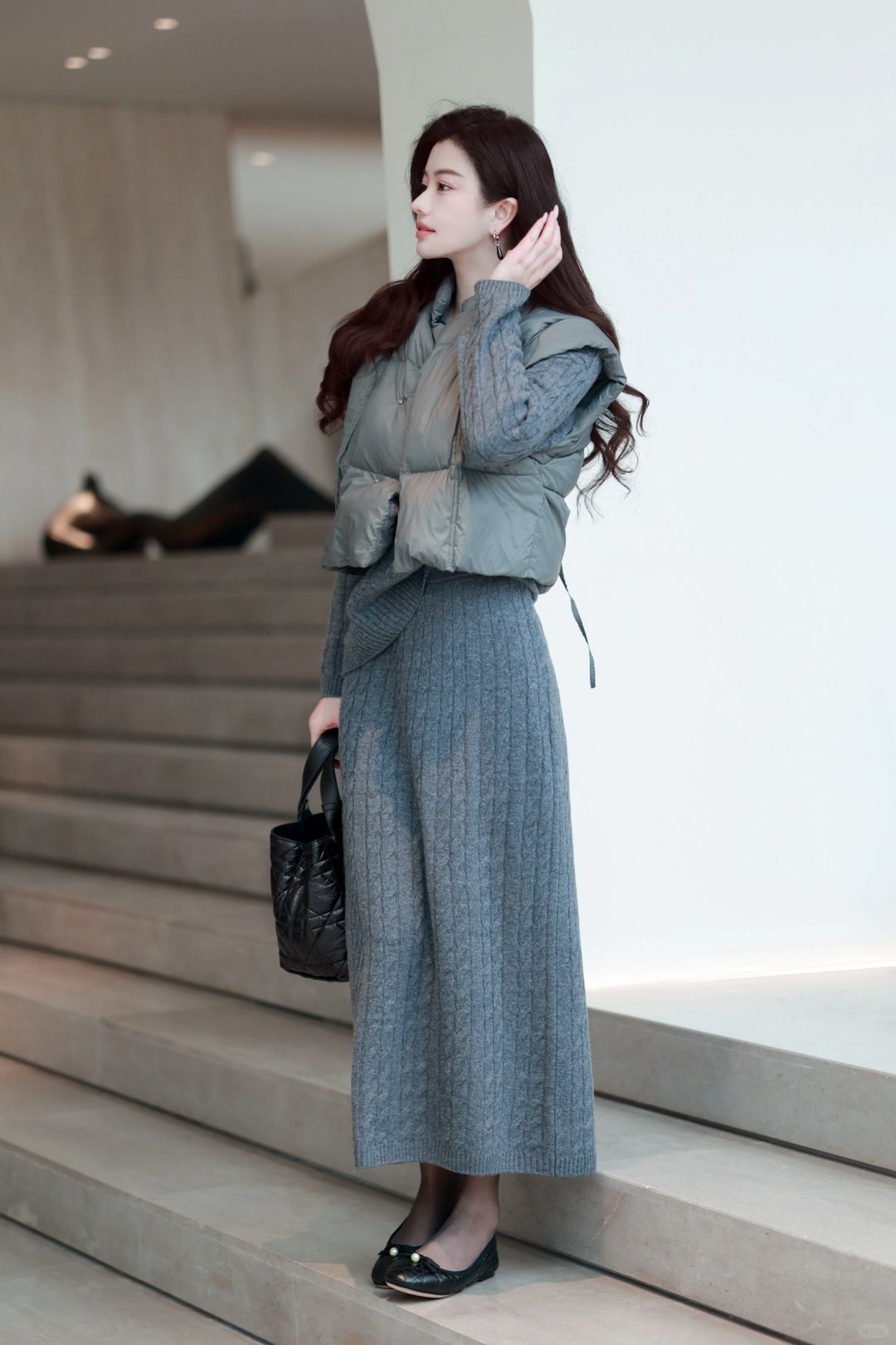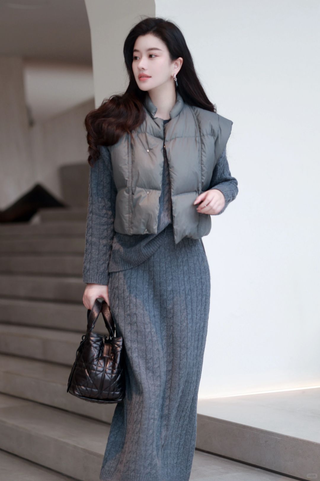 🤰后精致打扮到头发丝的臭毛病依旧没变,超轻便的灰色羽绒马甲,搭配麻花编织学院感毛衣与羊毛长裙,一身格雷系,静候春日光临。