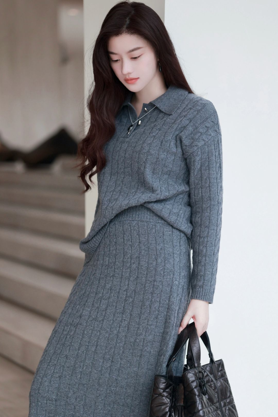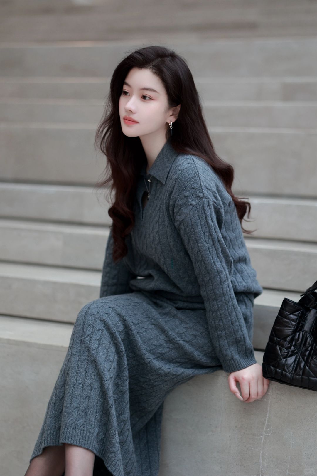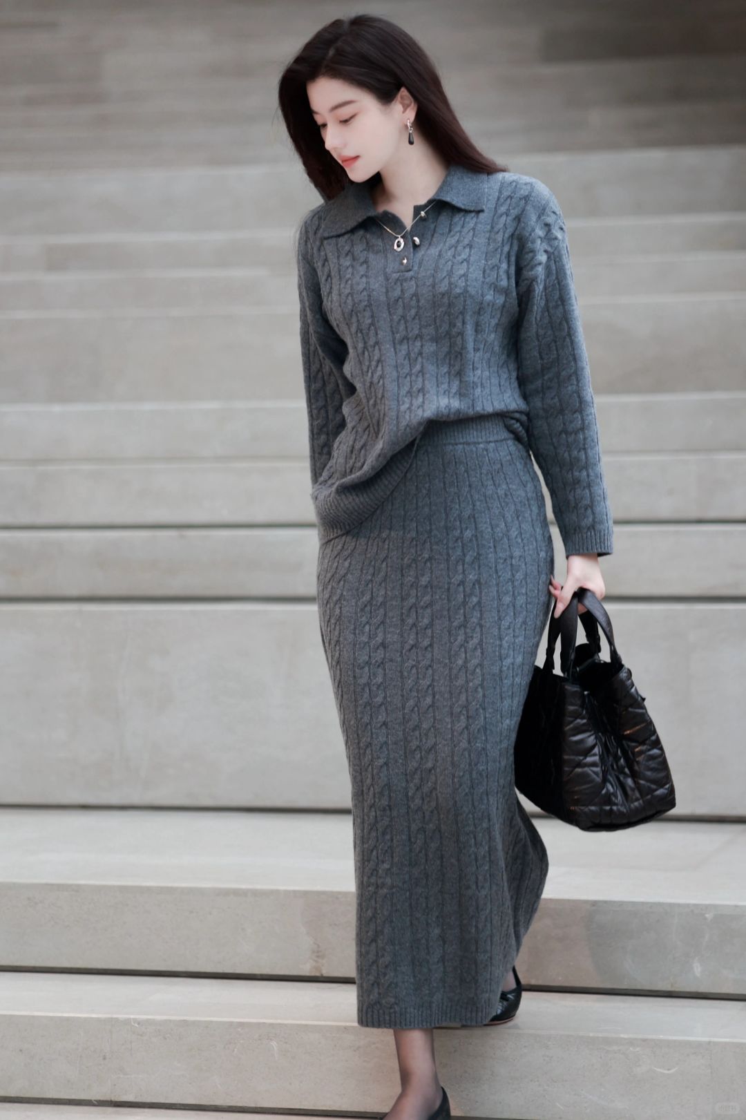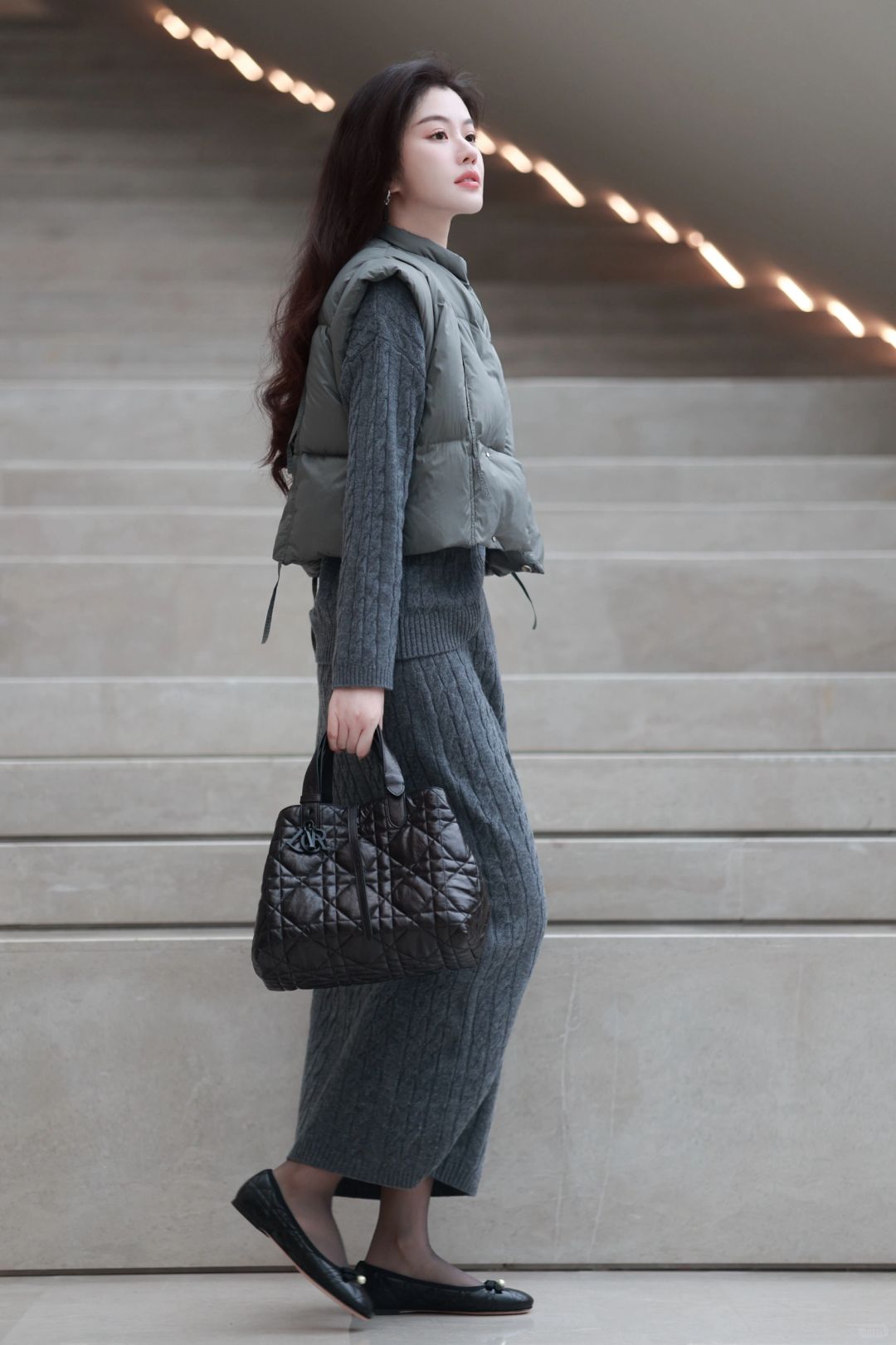 🤰后精致打扮到头发丝的臭毛病依旧没变,超轻便的灰色羽绒马甲,搭配麻花编织学院感毛衣与羊毛长裙,一身格雷系,静候春日光临。