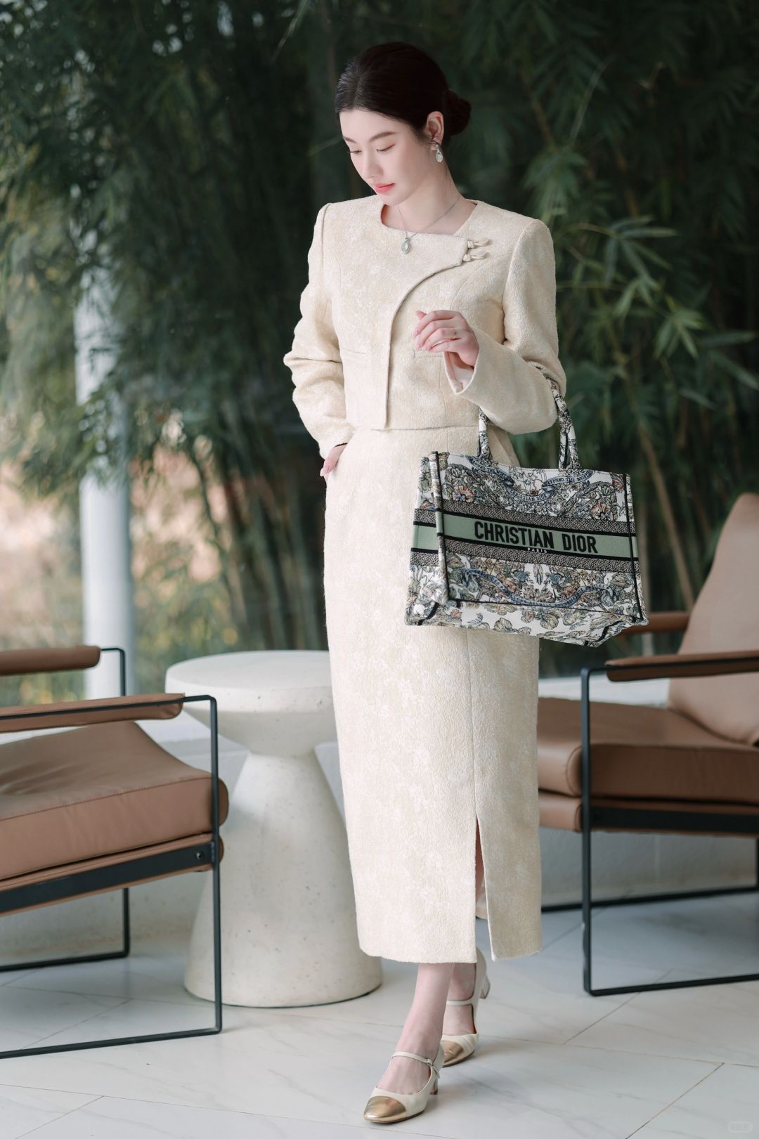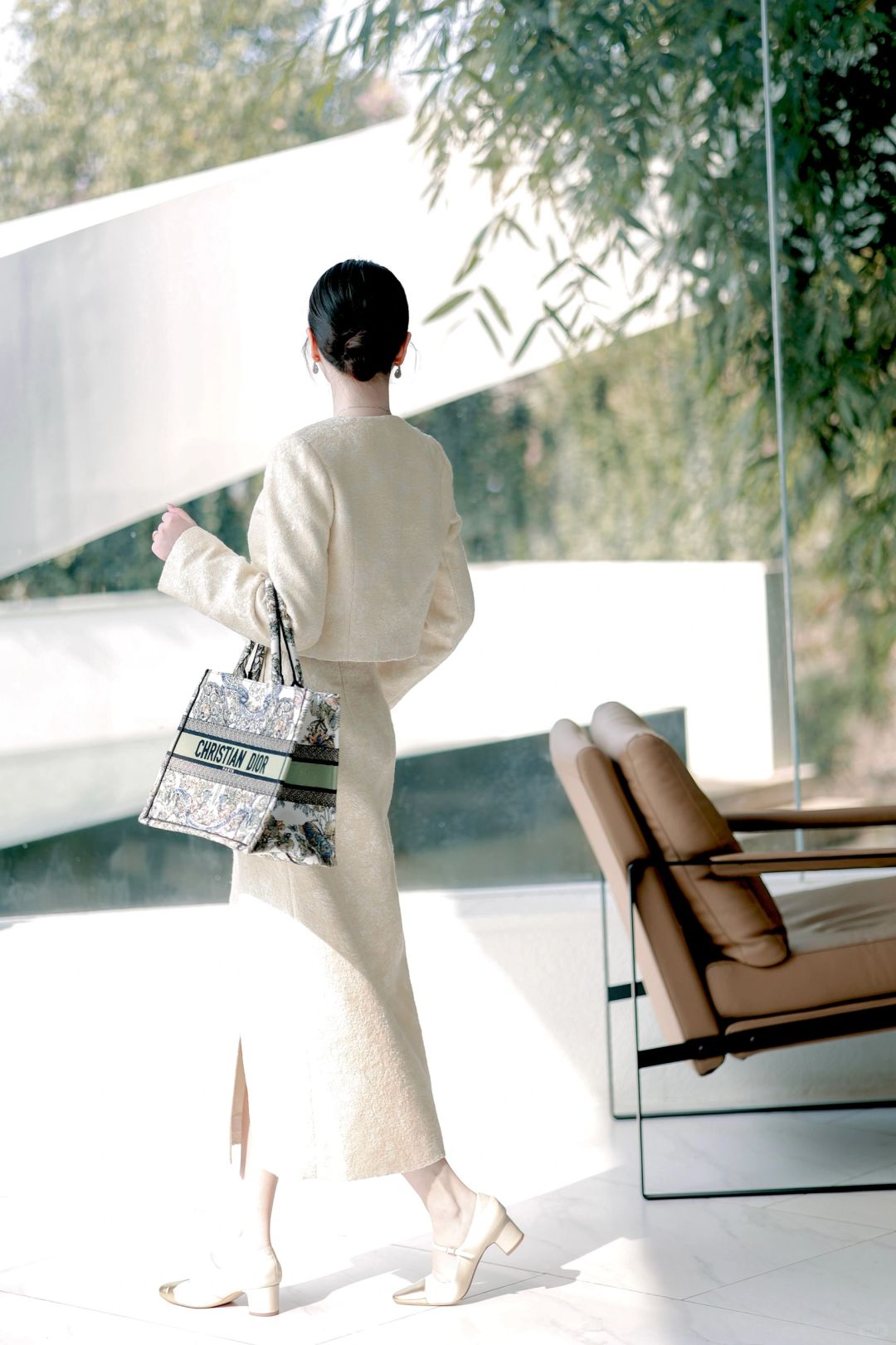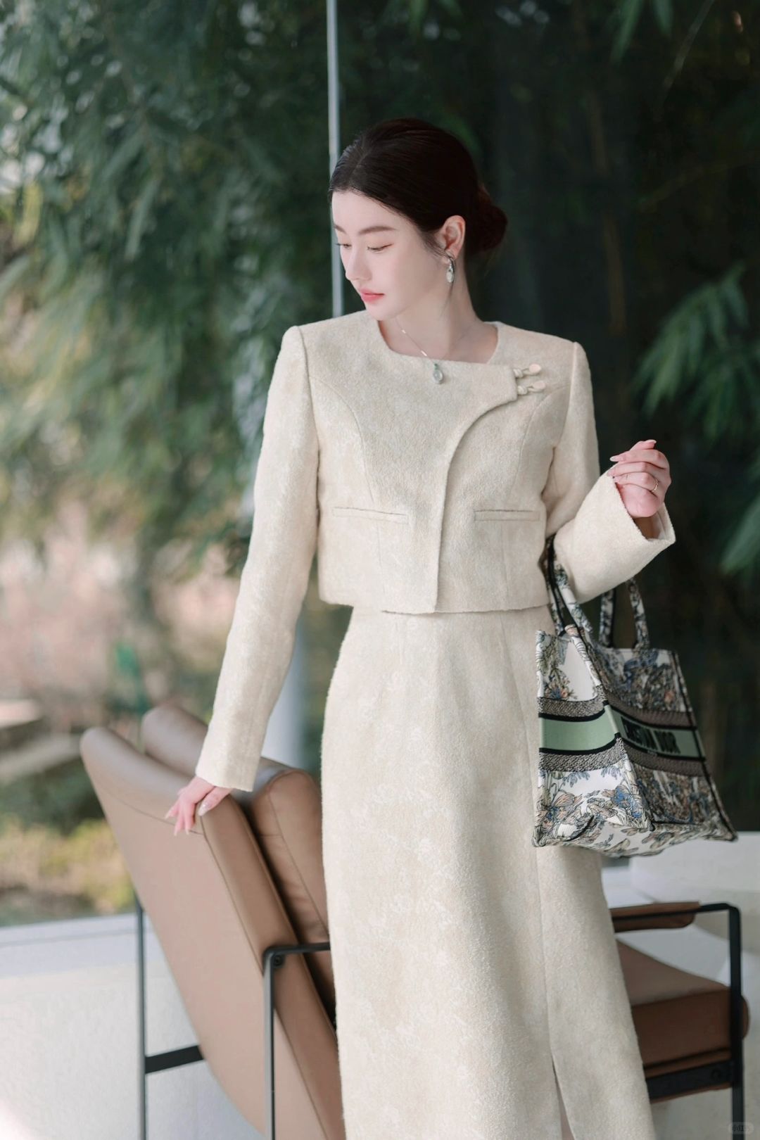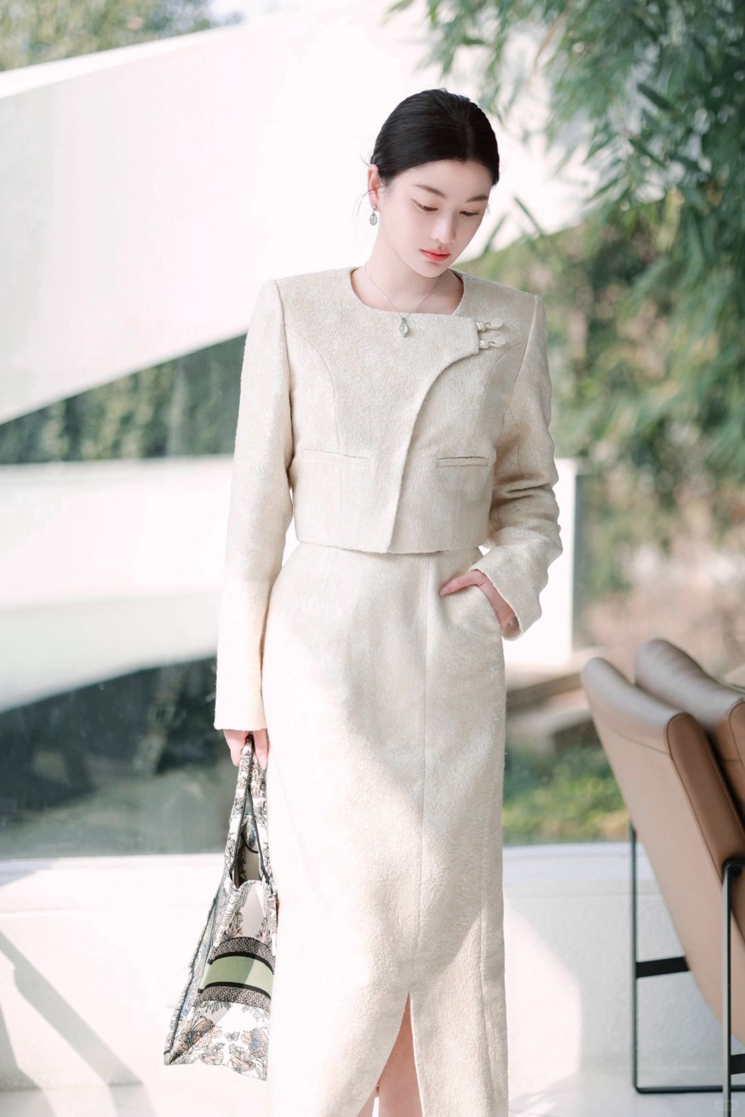 选择一身月白色暗纹新中式盘扣套裙出门,盘起了头发,一个东方女人的韵味就出来了,放在过年,这肯定是被赞不绝口的风格。