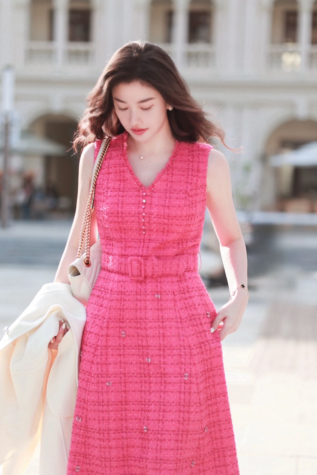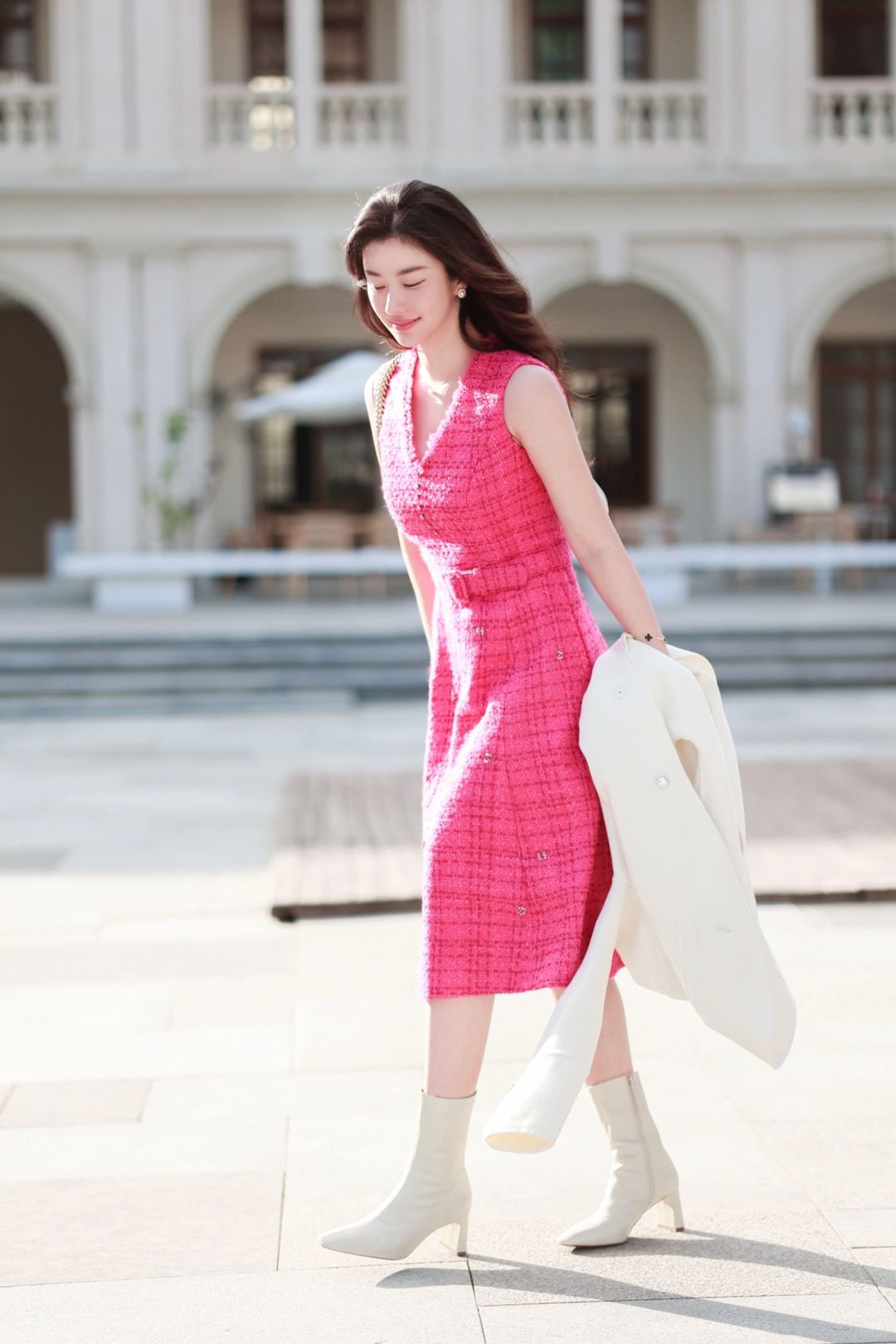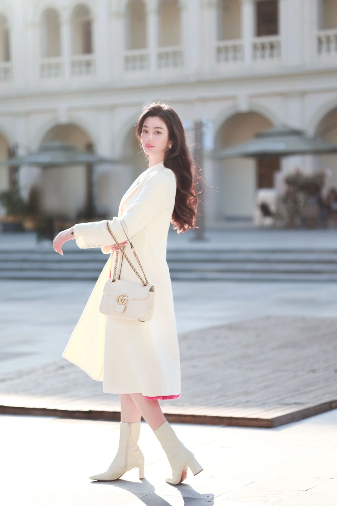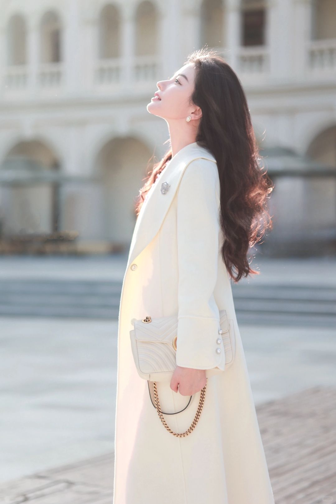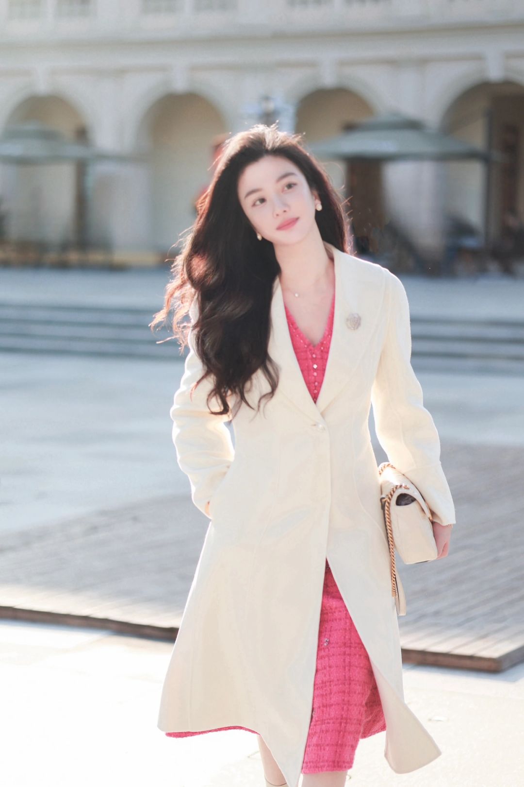 穿上一条完全还原弗洛伊德玫瑰的斜纹软呢连衣裙,像走进了一座法式玫瑰庄园,披一件白色羊毛大衣,山高水远云淡风轻。