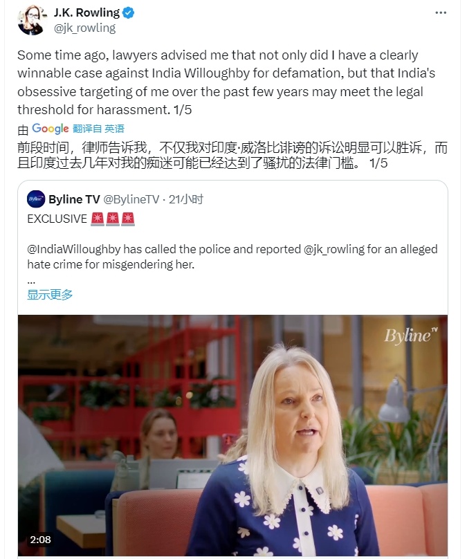 事情起源于本周一,J·K·罗琳在推特上和网友就「跨性别」问题展开唇枪舌战,一位网友发布了英国首位变性人新闻主持人India Willoughby的视频问问罗琳看法。