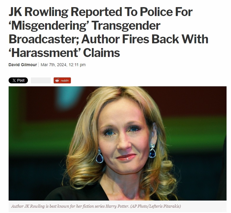 《哈利-波特》系列作者J·K·罗琳因为坚持称呼一位跨性别新闻主持人为“男人”而遭到后者报警。