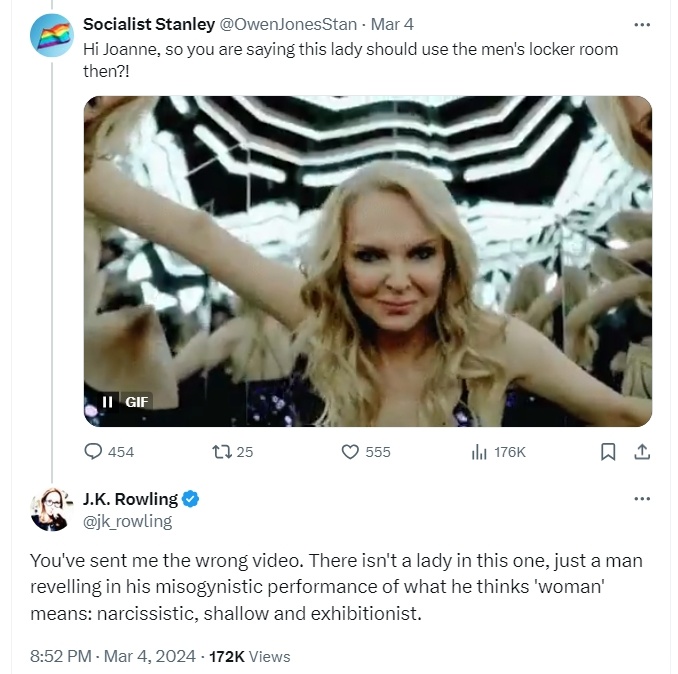 J·K·罗琳回复这位网友:“你发错视频了。这个视频里没有女人,只有一个男人陶醉在他自以为是女性但其实是厌女的理解中 —— 自恋、肤浅、而且是个露阴癖。”