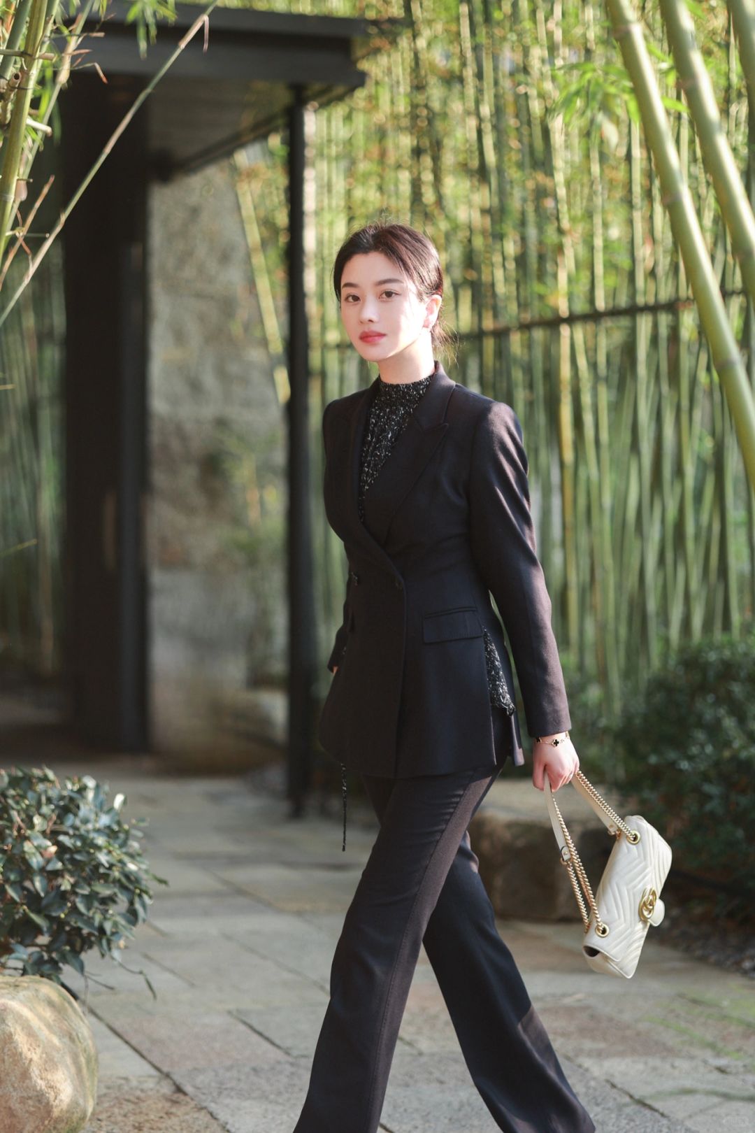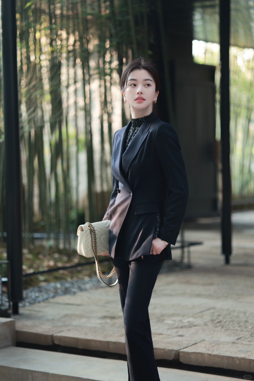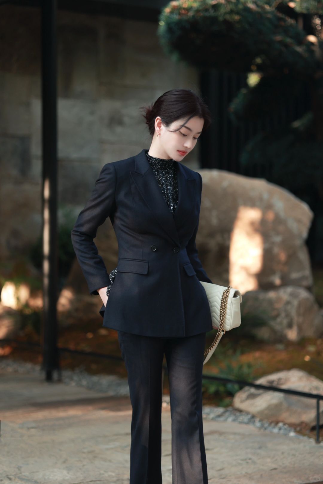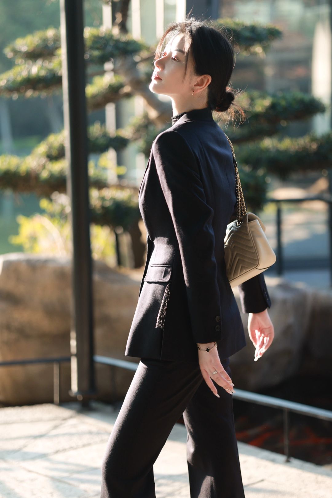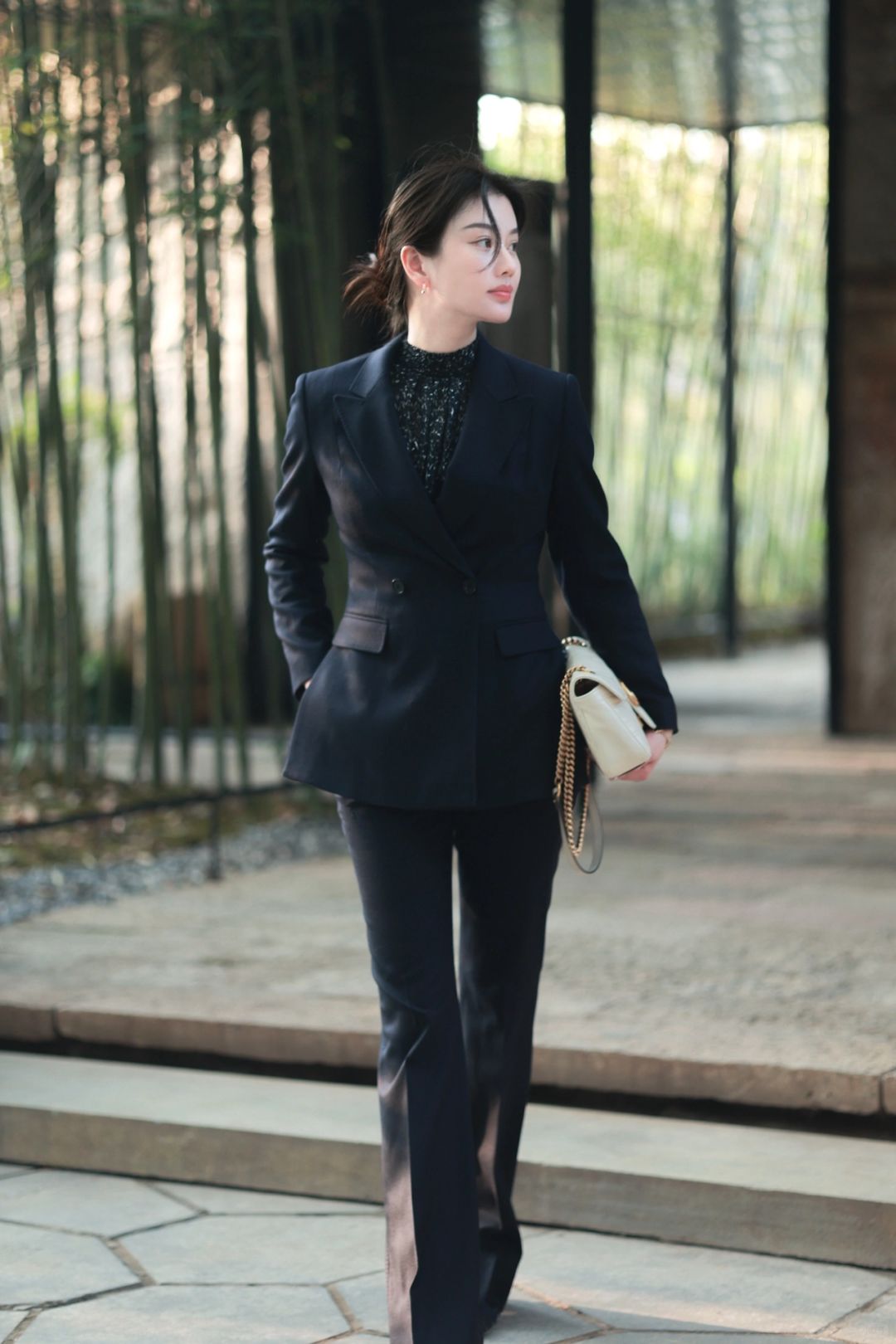 一套绅士蓝色、剪裁精良修身的羊毛西装和微喇西裤