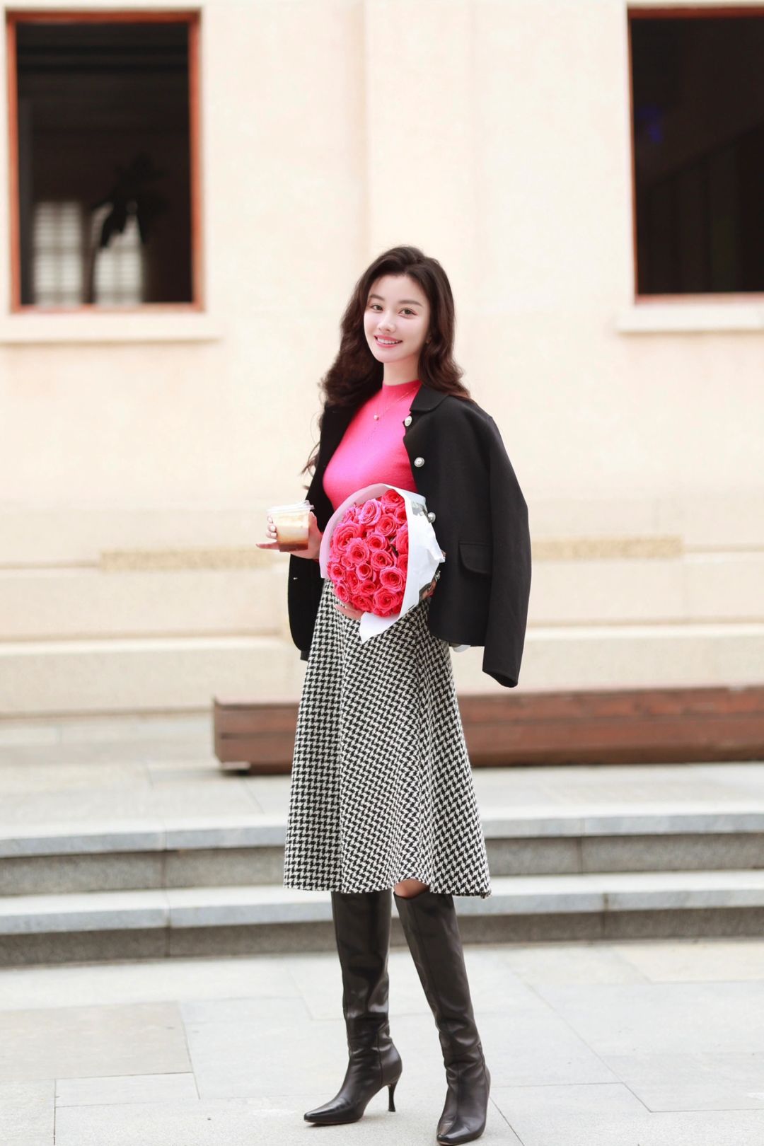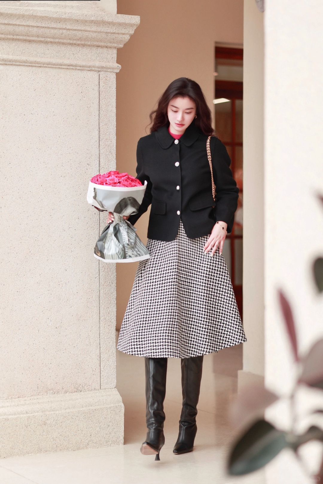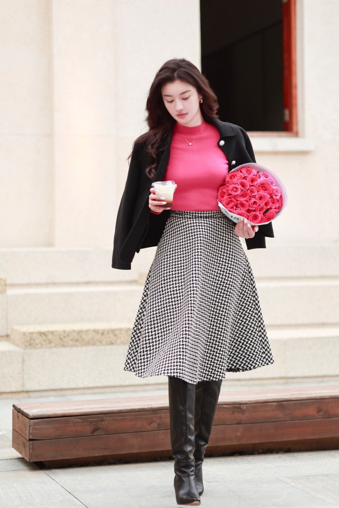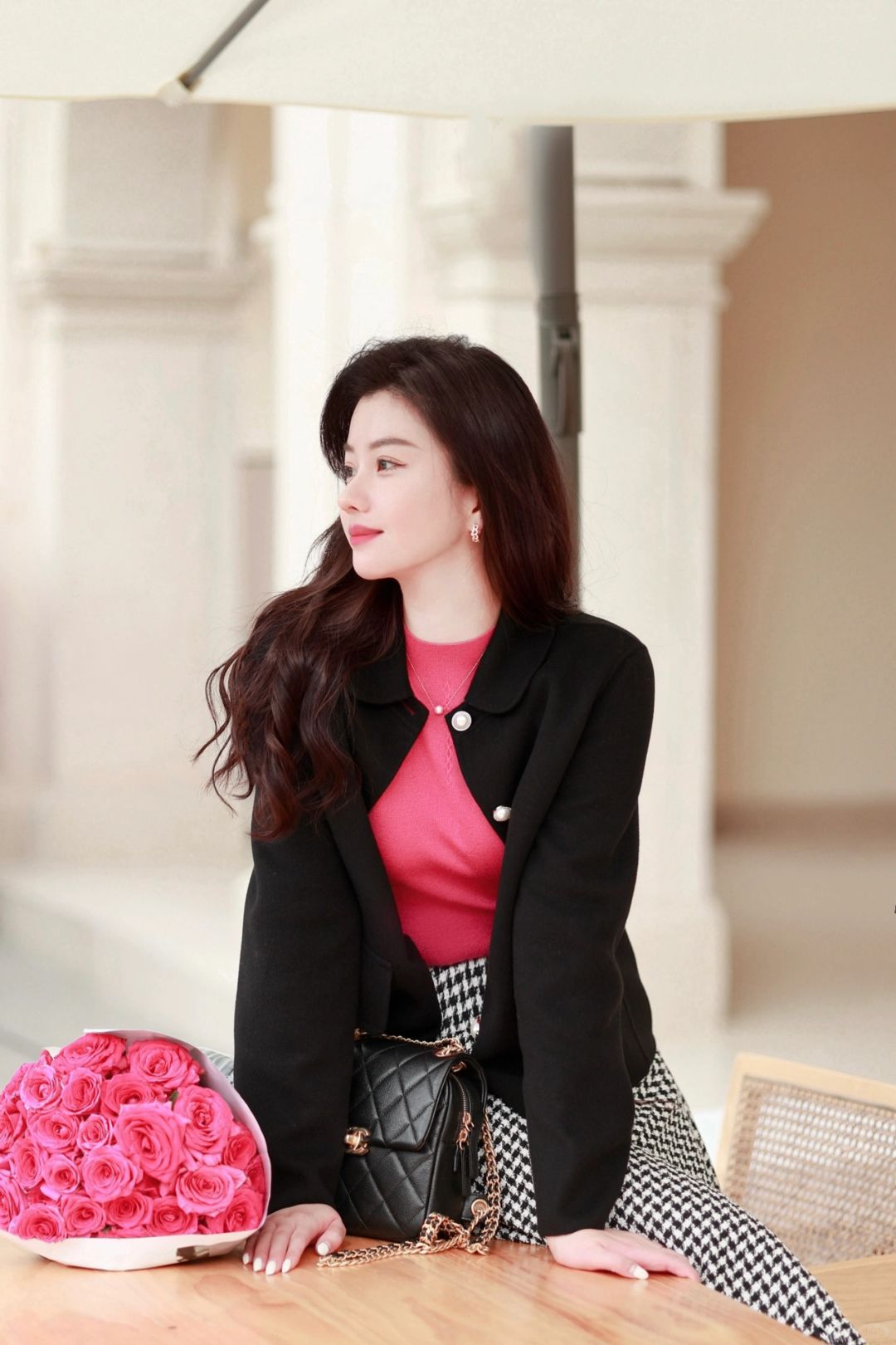 弗洛伊德玫瑰的洋红色拥有炽热的生命力,让本不晴朗的天气变得明媚起来,将这样一抹洋红放在不高调的法式穿搭中,既温柔又坚韧。