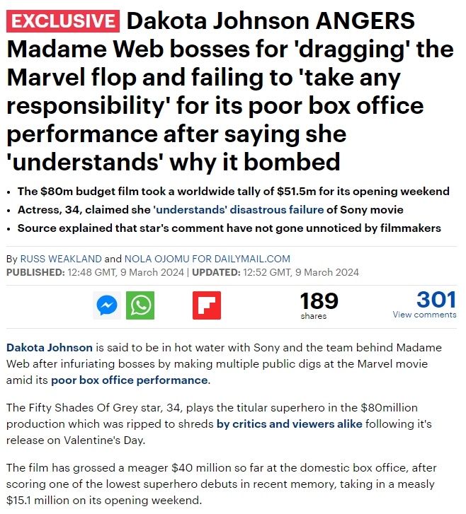 据报道,索尼影业及《蜘蛛夫人》幕后团队和女主角「达妹」Dakota Johnson之间关系紧张,因为她在票房表现不佳的情况下多次公开挖苦她主演的《蜘蛛夫人》,激怒了公司老板。