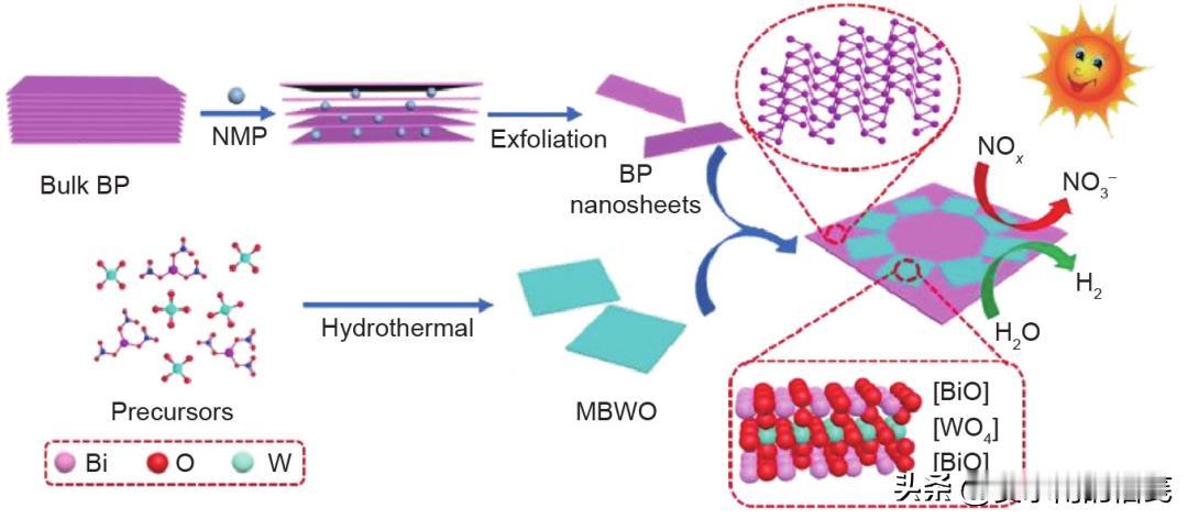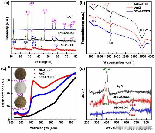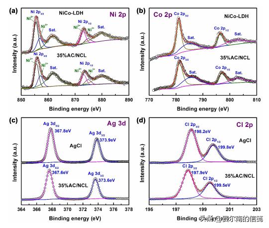 瞬态光电流响应谱和电化学阻抗谱研究现状 在本章节中,为了研究电子−空穴分离效率,我们分析了样品NiCo-LDH、AgCl和AC/NCL的瞬态光电流响应谱和电化学阻抗谱(EIS)。 在复合电极AC/NCL电极中观察到光电流密度的显著增加,比NiCo-LDH电极显示出相对低的光电流密度高18.5倍,比AgCl电极显示出的光电流密度高1.3倍。 这归因于AgCl纳米颗粒锚定在花球状NiCo-LDH表面形成凸触的优质结构。 瞬态光电流响应表明,复合材料AC/NCL在所有样品中表现出最高光电流密度,证实了其最佳的电荷转移和分离效率。 值得注意的是,AC/NCL结构的构建不仅促进了光子吸收,而且增强了光生电子−空穴对的分离。 为了深入了解电极内部的电荷传输行为,EIS(图3.6(b))用于评估界面处的电荷转移动力学。 半导体−电解质界面处的电荷转移电阻根据奈奎斯特曲线的弧半径进行评估。 显然在三个电极中,可以观察到AC/NCL电极在奈奎斯特曲线图像上显示出比两种单体NiCo-LDH和AgCl更小的圆弧半径,这表明了复合材料AC/NCL具有最低的电阻值,因此对于光生电荷的加速转移和传输以及对于AC/NCL中良好的电荷分离具有最高的电导率,从而证明了相结在催化过程中的积极作用。 进行电子顺磁共振波谱(EPR)测量,通过DMPO(5,5−二甲基−1−吡咯啉−N−氧化物)进行捕获实验验证测定超氧阴离子自由基(•O2−)和羟基自由基(•OH)信号,证明AC/NCL中的界面电荷转移是否符合z型异质结。 如图3.7(a)所示,在黑暗条件下AC/NCL没有检测到显著峰值信号,随着光照时间逐渐增加,在进行光照2分钟后,复合样品AC/NCL在可见光照射下产生6个关于•O2−峰值信号,随着光照时间的逐渐增加4分钟,关于•O2−峰值信号逐渐明显。 同时如图3.7(b),在相同的辐照条件下将复合样品AC/NCL分别进行光照2分钟和4分钟,复合样品AC/NCL随着光照时间的增加,并没有表现出•OH信号。 因此,•O2−在AC/NCL光催化反应中起主要作用,为了获得有关AC/NCL光降解机理过程的主要活性氧化剂。 因此,超氧自由基(•O2−)和空穴(h+)都是染料催化光降解的活性物质,其中•O2−在AC/NCL降解中起到主要作用,而羟基自由基(•OH)物质的作用可以忽略不计。 当复合材料AC/NCL所形成n-n异质结光催化剂受到光照射时,n型半导体NiCoLDH和n型半导体AgCl都被光激发,在其导电中产生非平衡电子,在价带中产生空穴。 当复合材料AC/NCL所形成n−n异质结处建立的热平衡状态被打破时,两个半导体之间形成的内建电场和势垒。 光生电子必须克服势垒从n型半导体NiCo-LDH的导带流向n型半导体AgCl的导带;相反,电子运动必须克服的势垒从n型半导体AgCl的价带运动到n型半导体NiCo-LDH的价带。 同样的,光激发空穴需要克服势垒从n型半导体AgCl的价带运动到n型半导体NiCo-LDH的价带,而空穴运动需要克服势垒从n型半导体NiCo-LDH的价带到价带。 然而,n型半导体AgCl的导带中的光生电子倾向于迁移到n型半导体NiCo-LDH的价带并与n型半导体NiCo-LDH的价带中的光生空穴复合。 正是因为载流子转移和重组过程,所形成的z型AC/NCL异质结机制,延长了n型半导体NiCo-LDH的导带中的光激发电子和n型半导体AgCl的价带中的空穴的寿命,从而使二者更有效地参与光催化反应。 因此,z型AC/NCL异质结光催化剂有望表现出增强的光催化性能。 在本章工作中,介绍了利用改进的常温遮光搅拌方法制备尺寸均匀的纳米级别AgCl颗粒,并在乙二醇作用下在花球状NiCo-LDH表明生成AgCl纳米颗粒,进而将较少比例的AgCl纳米颗粒锚定在NiCo-LDH表面形成凸触得到半导体功能光催化材料AC/NCL。 并通过理论计算验证出具有纳米点状修饰的花球状结构的复合材料AC/NCL光催化降解亚甲基蓝机理。 表现出了通过纳米点状AgCl颗粒修饰的NiCo-LDH后,使结构的比表面积增大、活性位点增加,AgCl颗粒在NiCo-LDH表面作为一个桥梁加快了电子−空穴转移,因此表现出了良好的光催化性能。