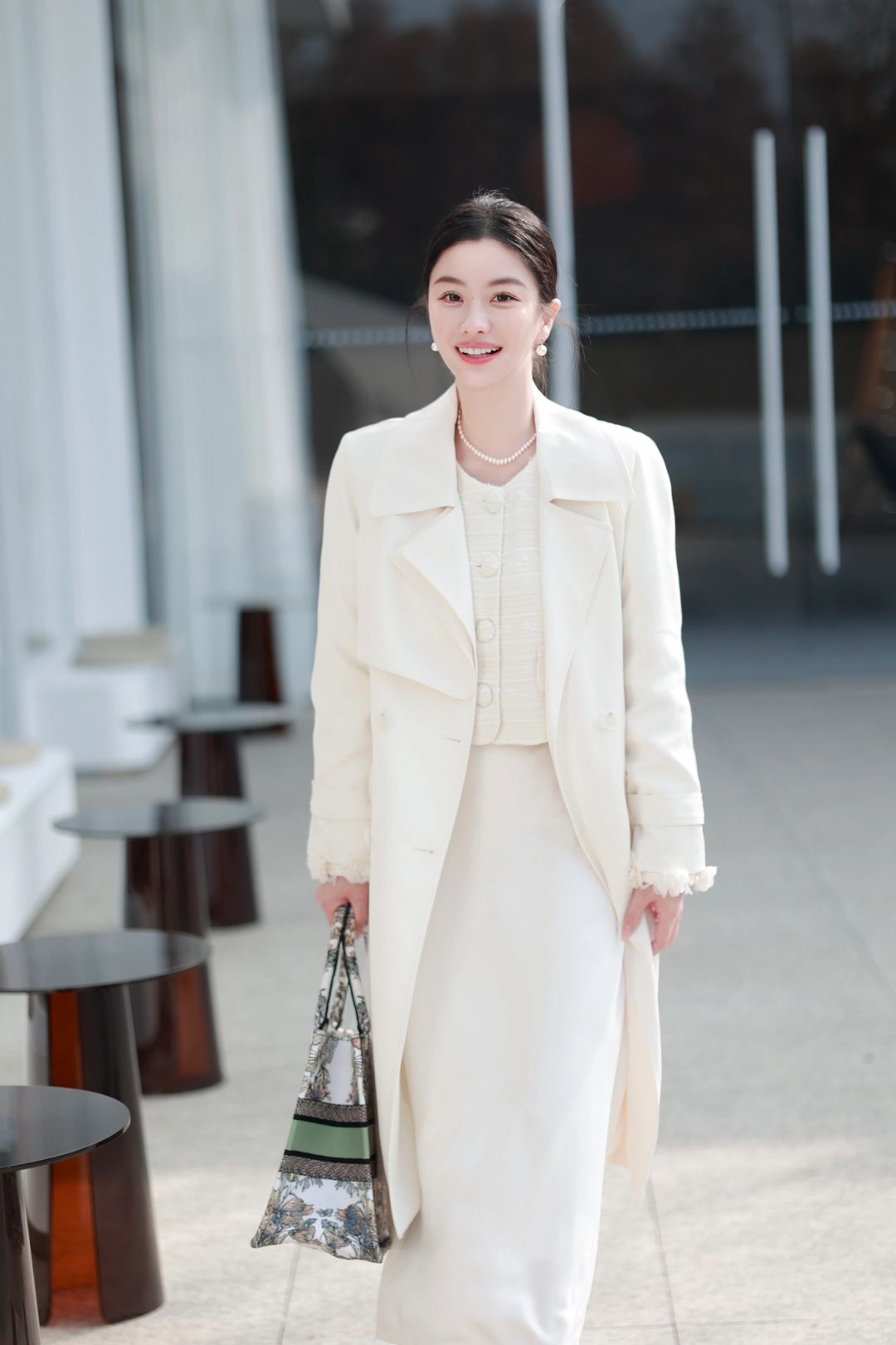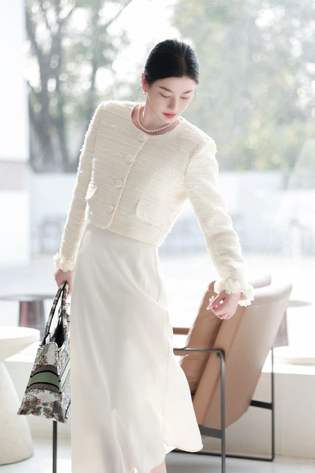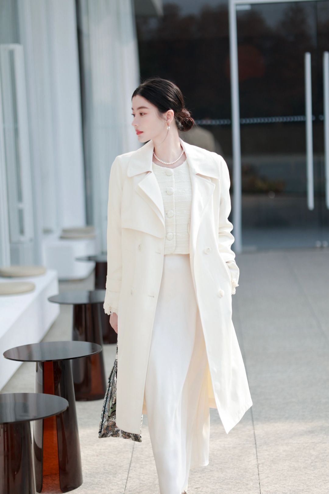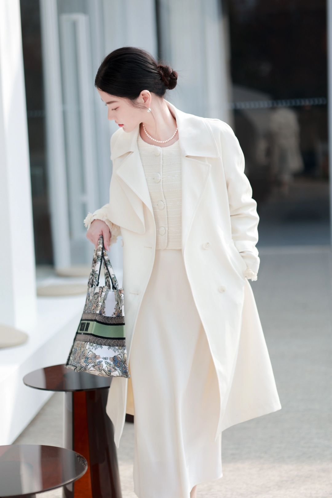 短款小香白外套的优雅似一身栀子白,轻盈的白色丝质裙摆清美如雪,披上我的白风衣,上下一白,像窗外的光、也像天上的云。