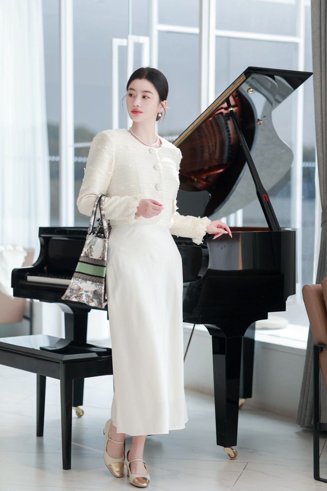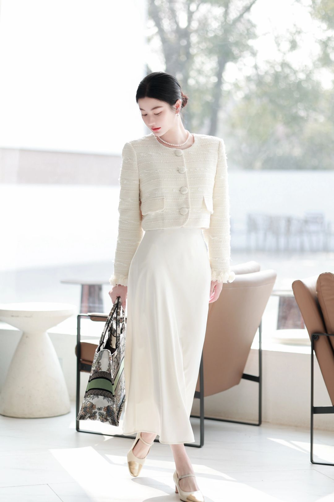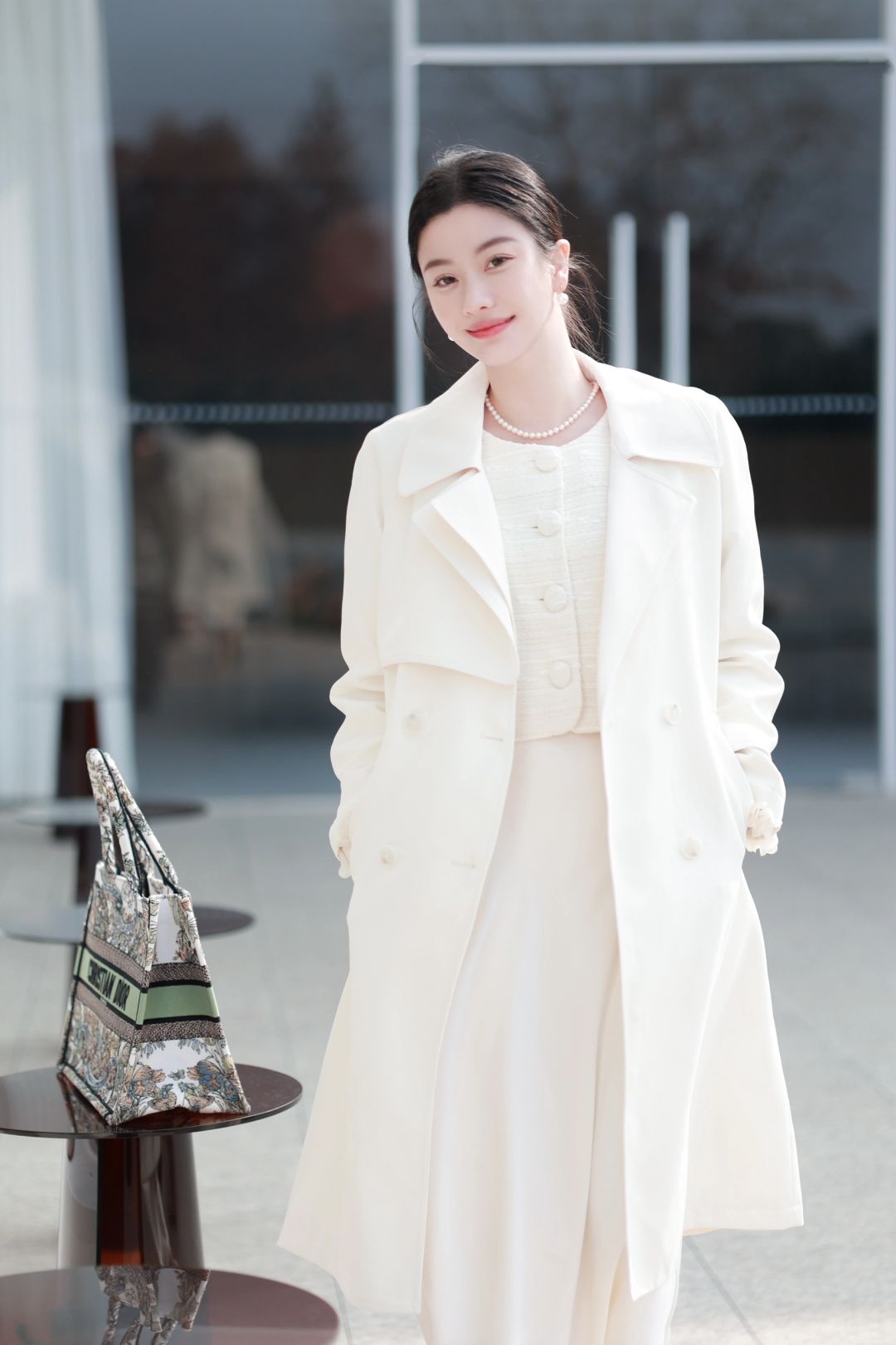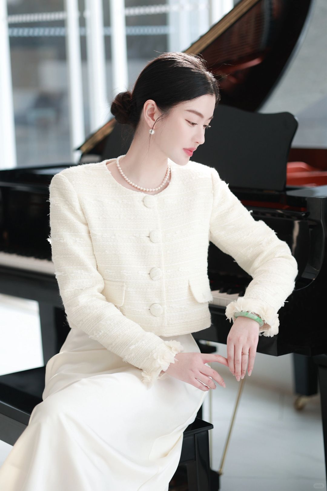 短款小香白外套的优雅似一身栀子白,轻盈的白色丝质裙摆清美如雪,披上我的白风衣,上下一白,像窗外的光、也像天上的云。