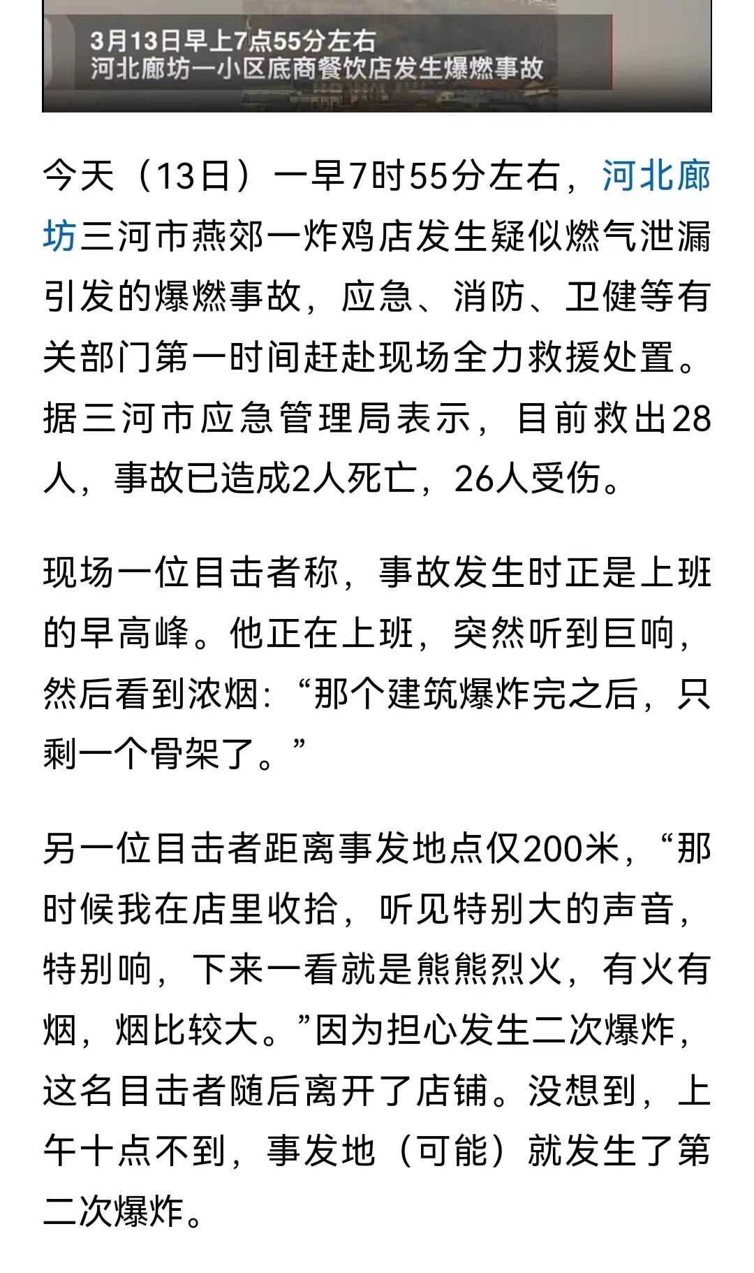 #燕郊炸鸡店爆燃后4层楼体发生坍塌# 这是一次人为的灾难,燕郊爆炸现场让人落泪,一栋楼房被炸的只剩楼架子,听说现在已经有7人死亡27人受伤。很多信息都把责任推向了一家炸鸡店,说是这个炸鸡店的责任。 这个炸鸡店站出来发声:我们用的是电,不是燃气! 看来,炸鸡店被冤枉了! 人家炸鸡店里面的工作人员现在都好好的,没有受伤。 他们炸鸡店早上不上班。 出事的时候,正好是早上7点55左右,炸鸡店还没有人去店里上班,这些人逃过了一劫 。 还有33岁的马秀兰,她是从甘肃来到燕郊坐拉面馆的。 她就在发生爆炸的楼的一层,开了一个拉面馆。 发生爆炸后,她的朋友拼命的打电话,却再也打不通她的电话啦。 燕郊爆炸事故亲历者说:爆炸时我住临楼,感觉像原子弹爆炸一样,玻璃都碎了,七八分钟的样子,120就来了,现场很狼狈的样子,冒着很浓的烟,四层楼都变成钢筋混凝土啦! 现场很惨烈,问题很复杂。 到底啥原因造成这么严重的问题! 我们继续等待官方调查结果公布。
