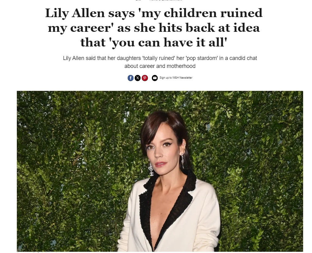 “你不可能熊掌和鱼都能有。” 莉莉·艾伦说道,“在事业上,我从来没有什么规划,但孩子们的确毁了我的职业生涯。我爱她们,她们让我的生命更完整了,但言论作为流行歌手的工作,他们完全毁了我的事业。”