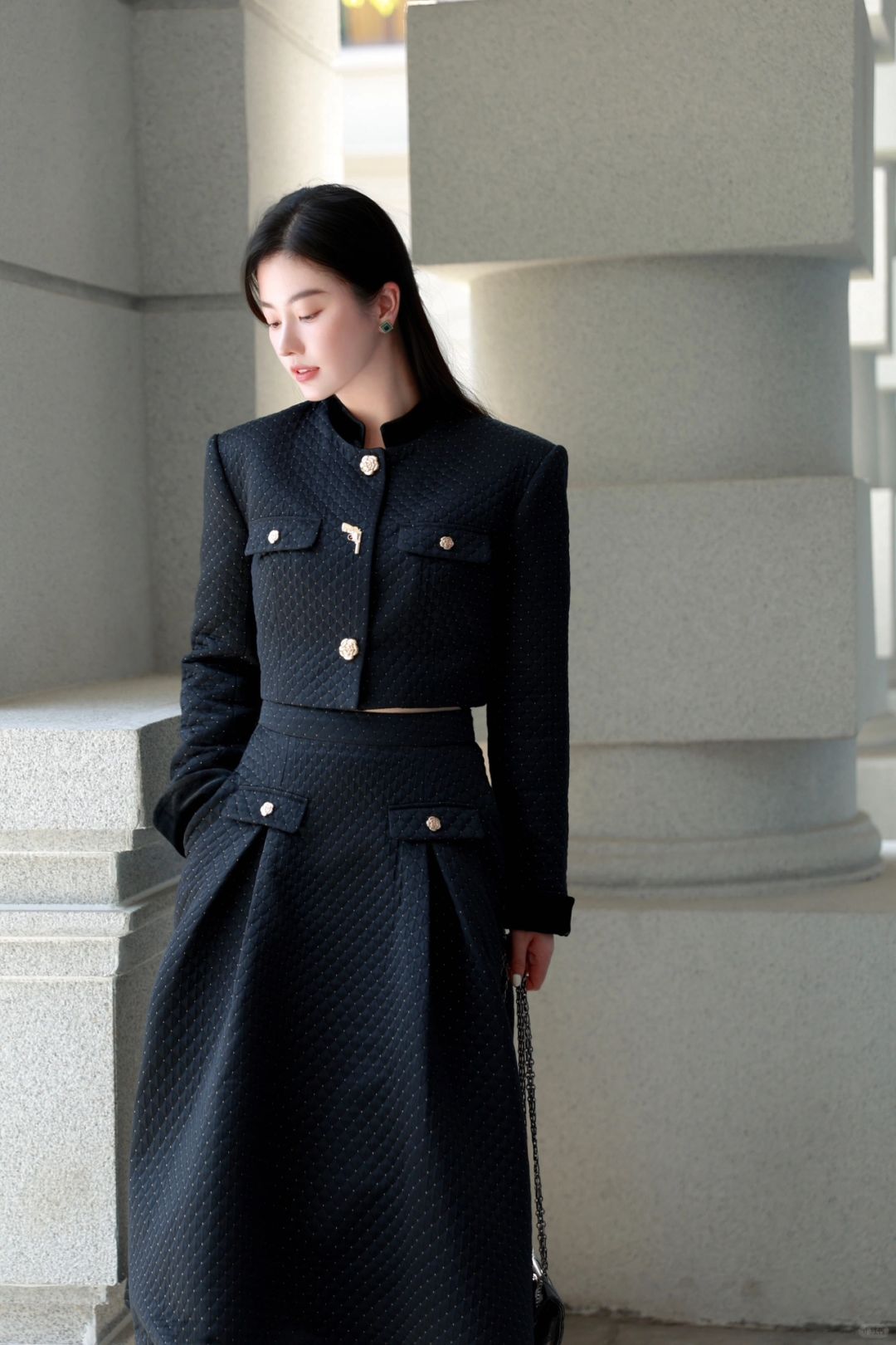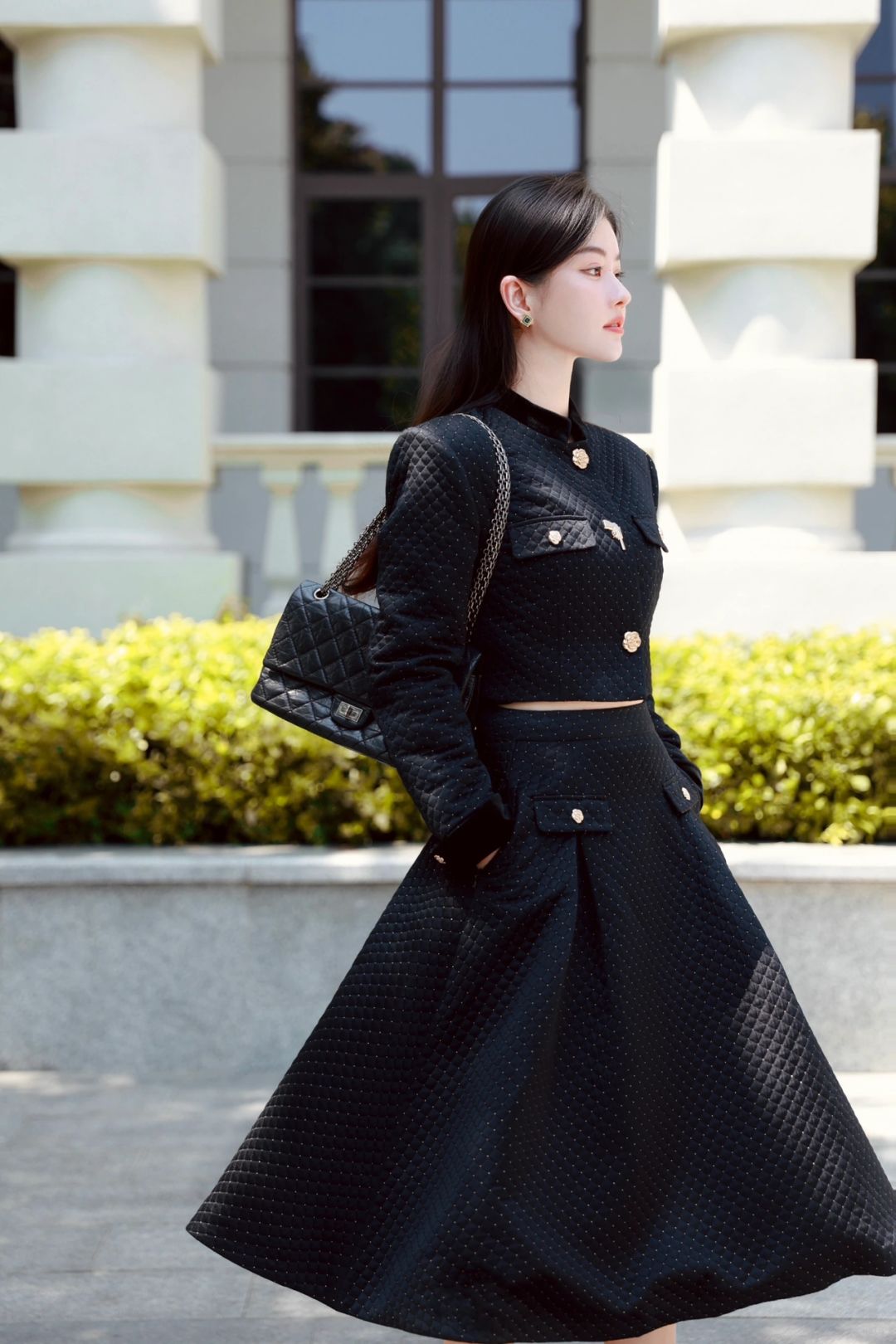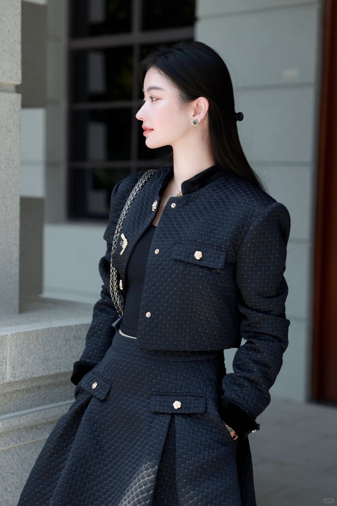 穿一套菱格纹黑金短西装与超大A字下摆半裙,一颗手枪形状的小金扣扣于心口,今天是财阀千金,亦或是偶像剧女2⃣️号?