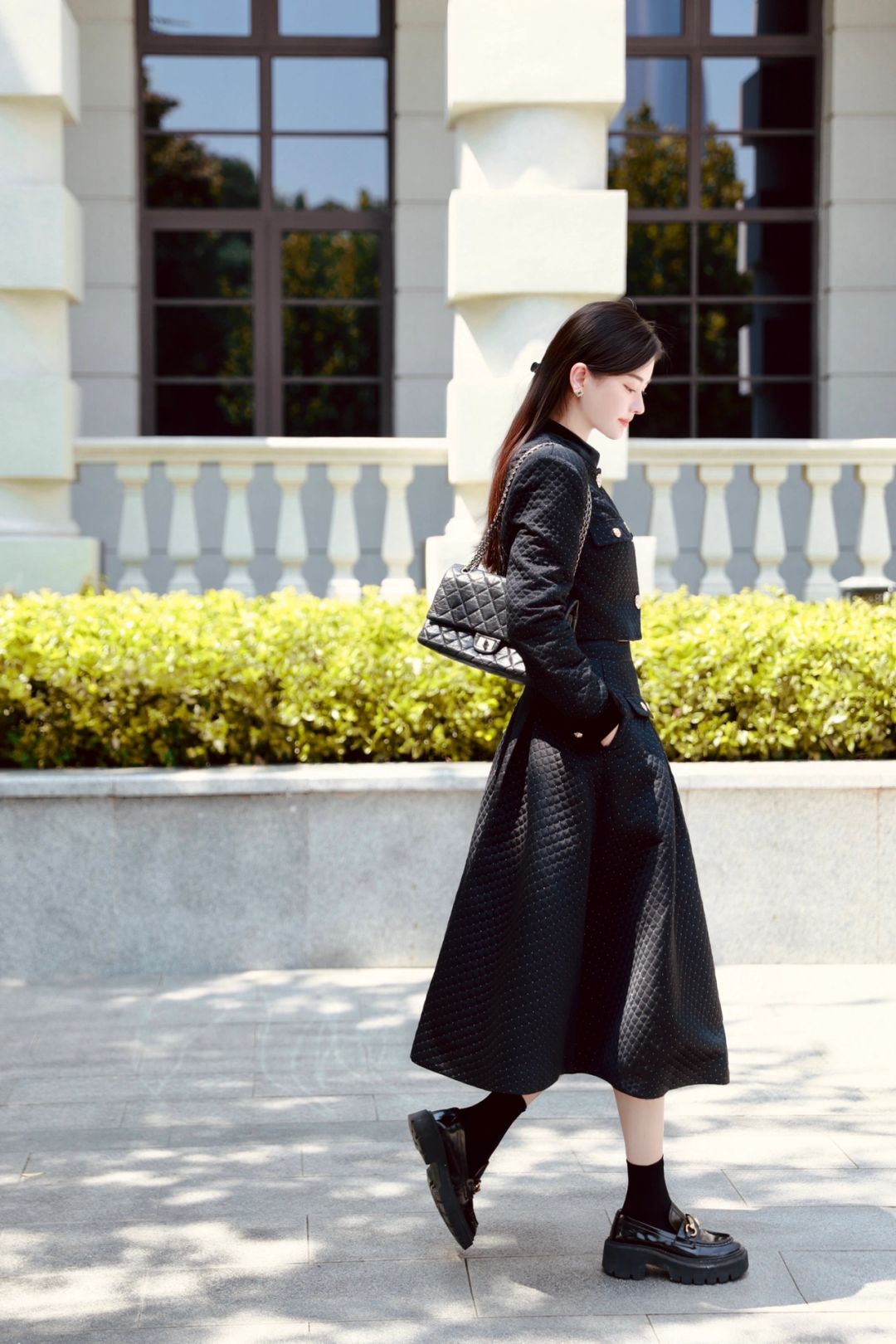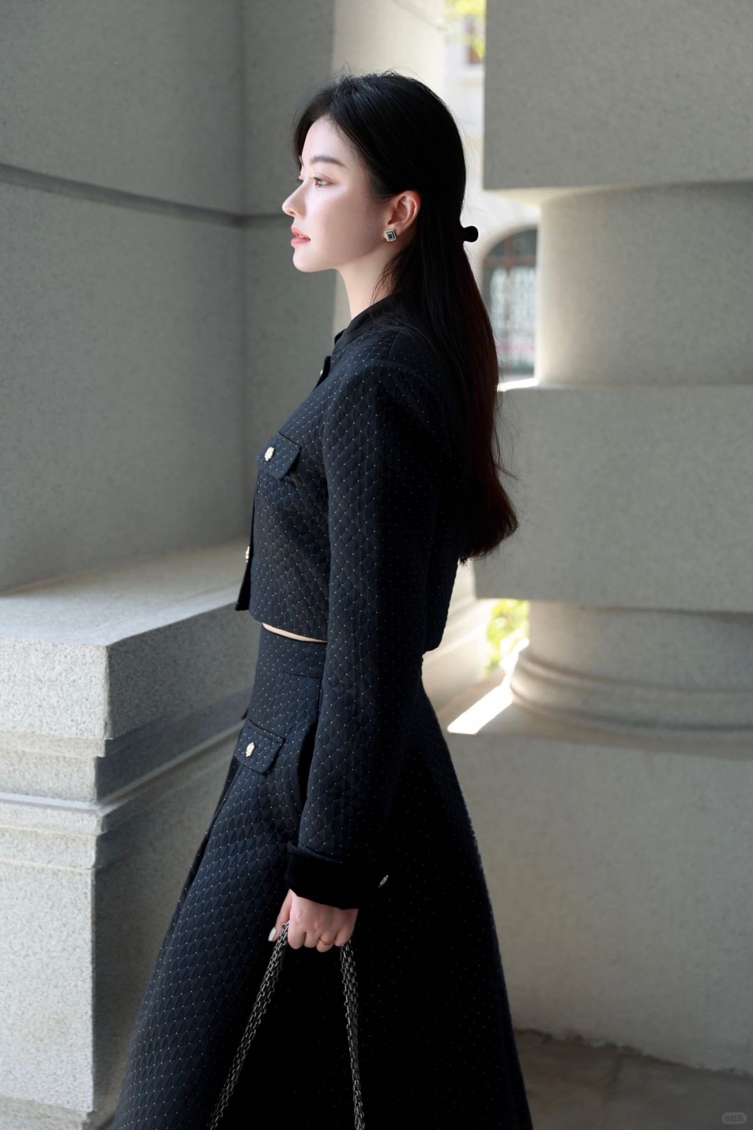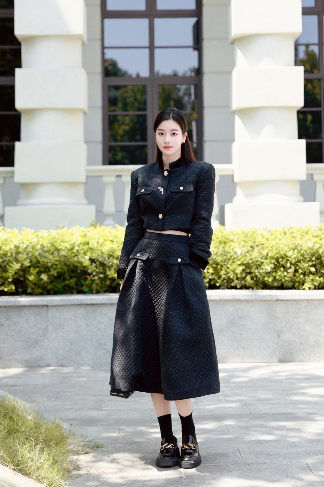 穿一套菱格纹黑金短西装与超大A字下摆半裙,一颗手枪形状的小金扣扣于心口,今天是财阀千金,亦或是偶像剧女2⃣️号?
