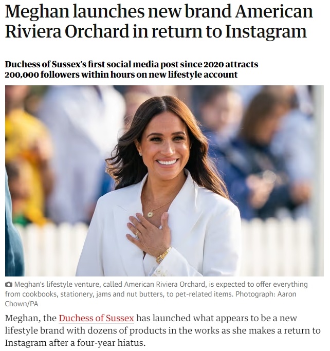 就在英国王室因为凯特王妃的抓马闹得鸡犬不宁的这个时间点,萨塞克斯公爵夫人梅根宣布推出名为“American Riviera Orchard”的新生活方式品牌,并上线了新网站和Ig账号。