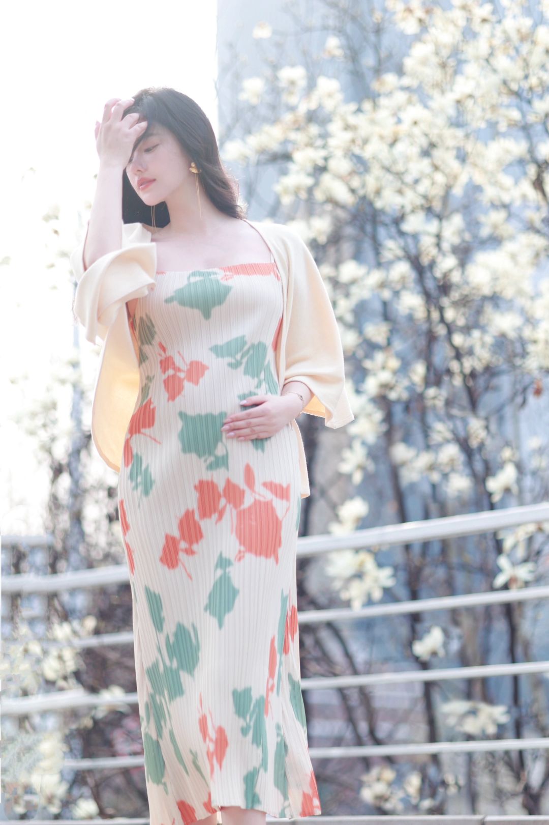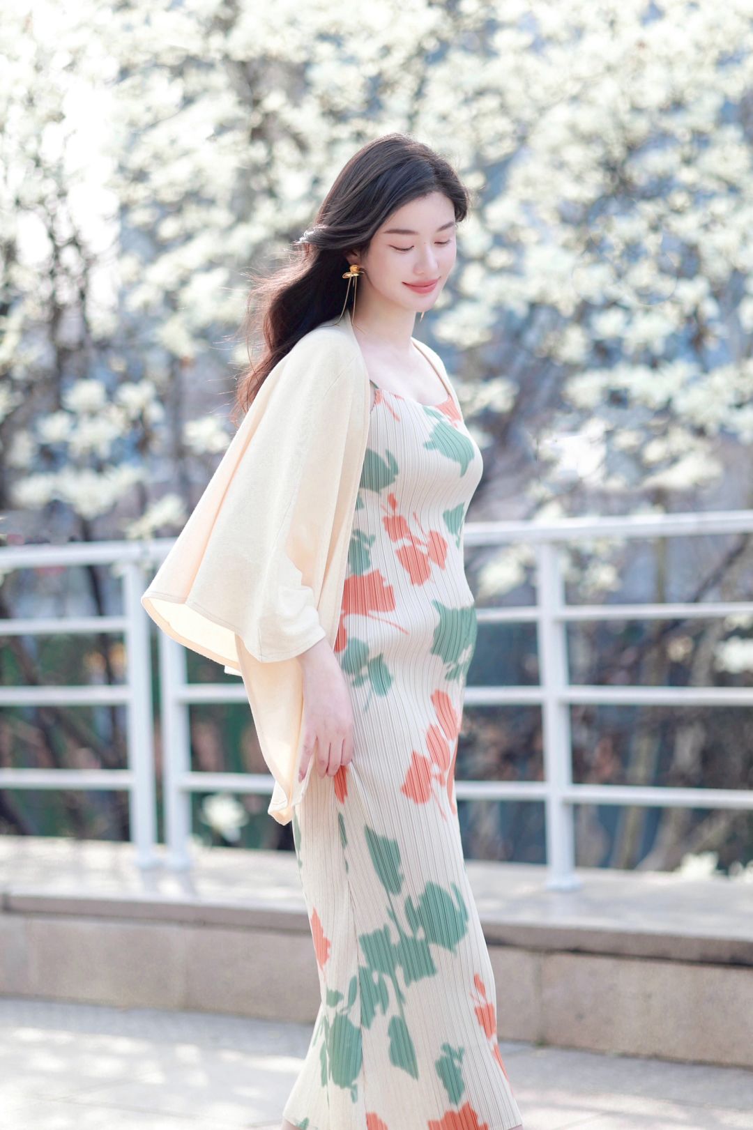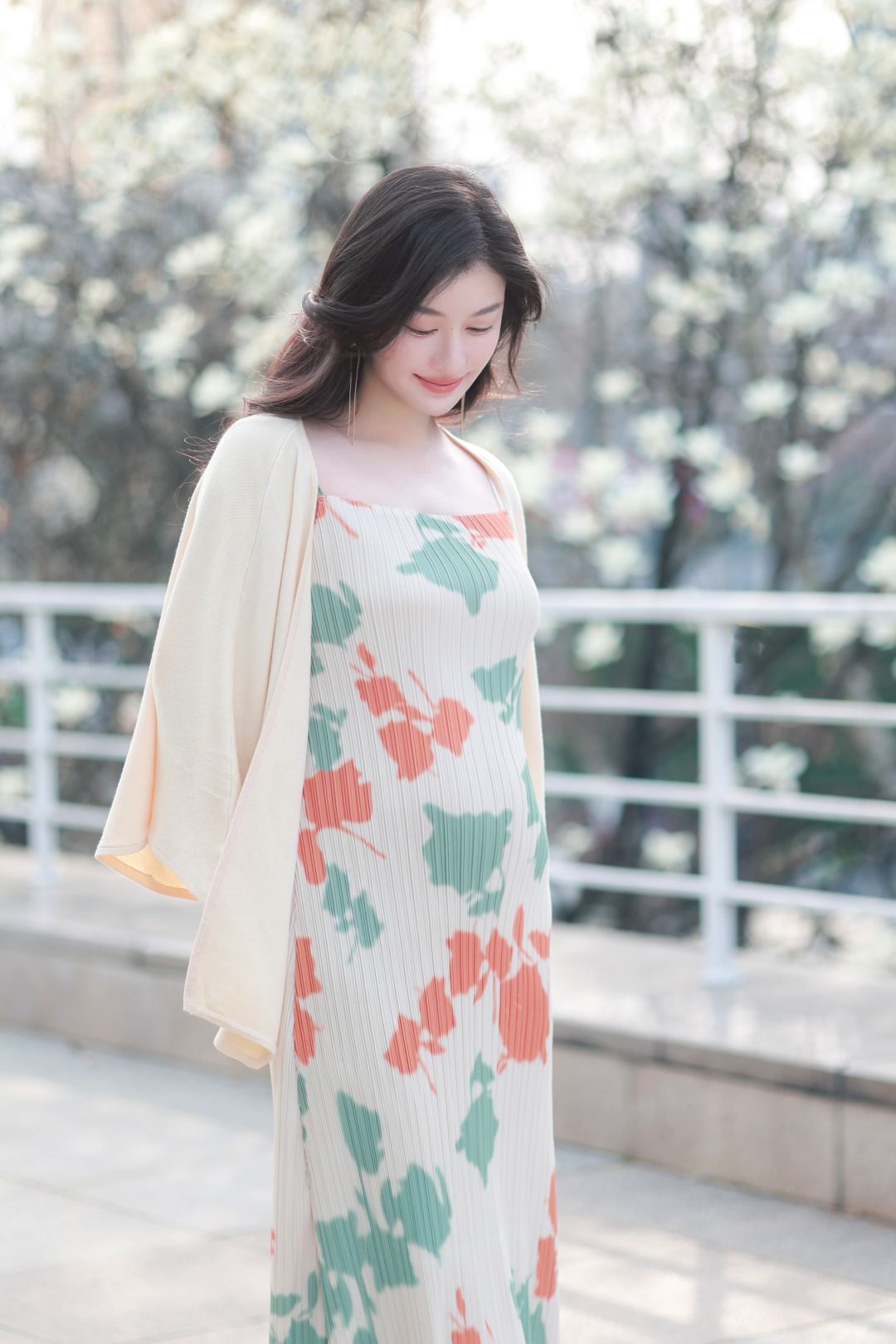今日这条水墨画褶皱裙作为孕妇裙太合适了,披一条同色系披肩,仿佛是风有了形状。