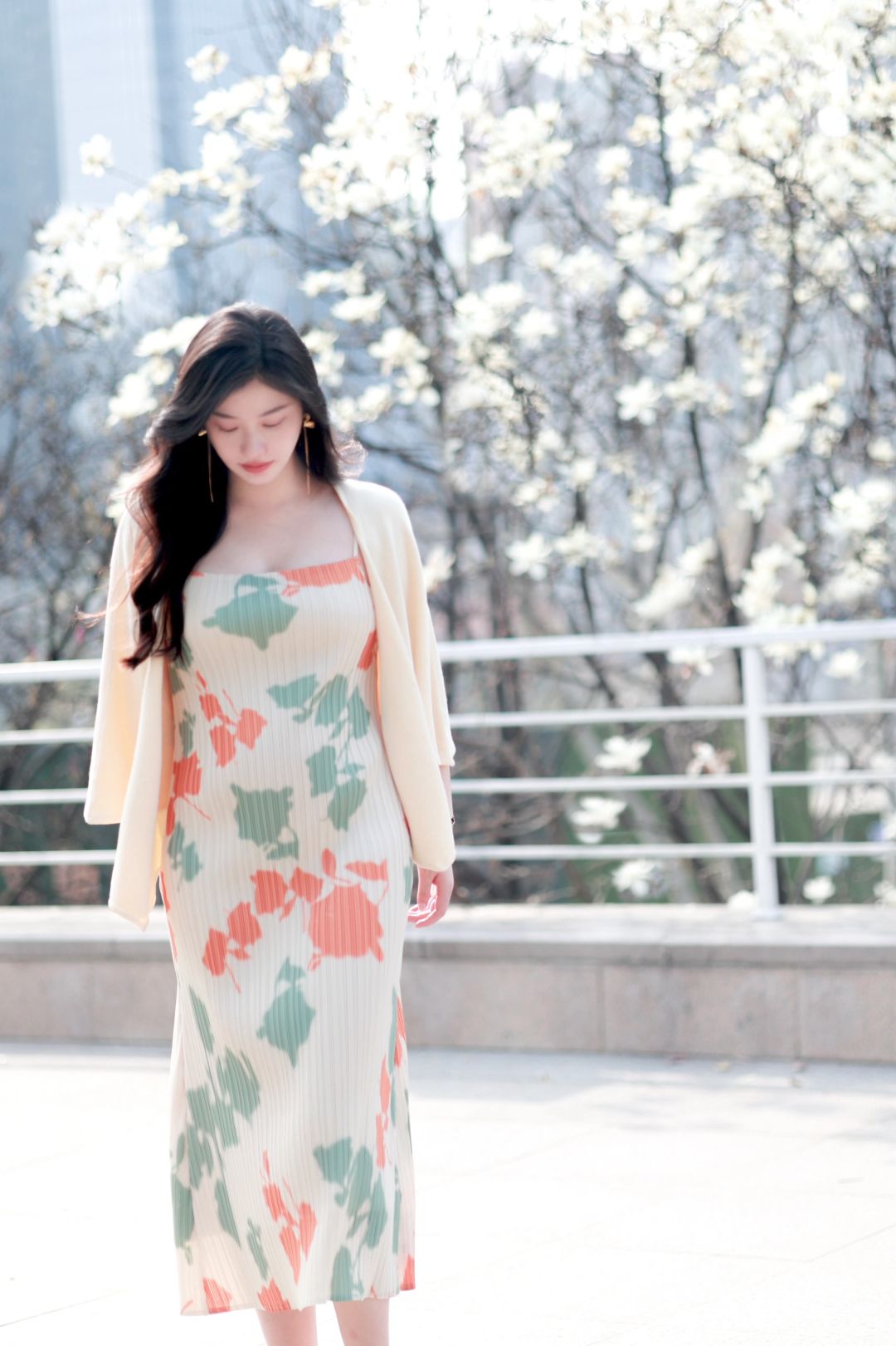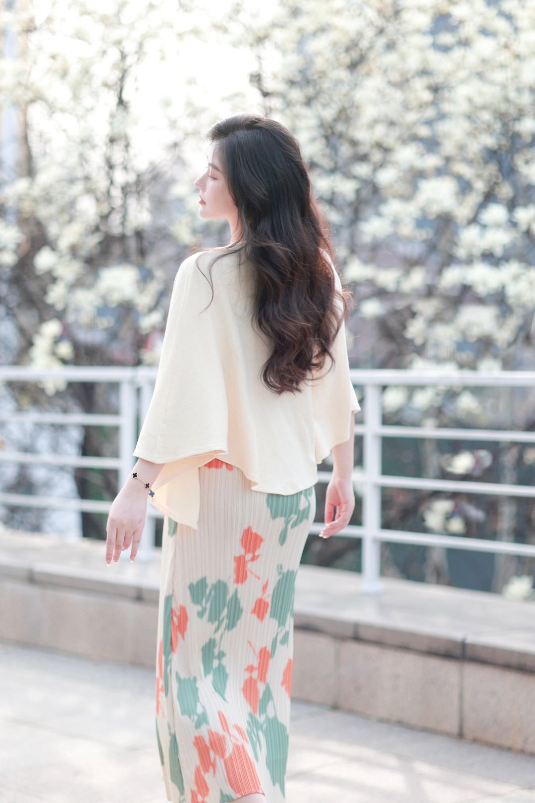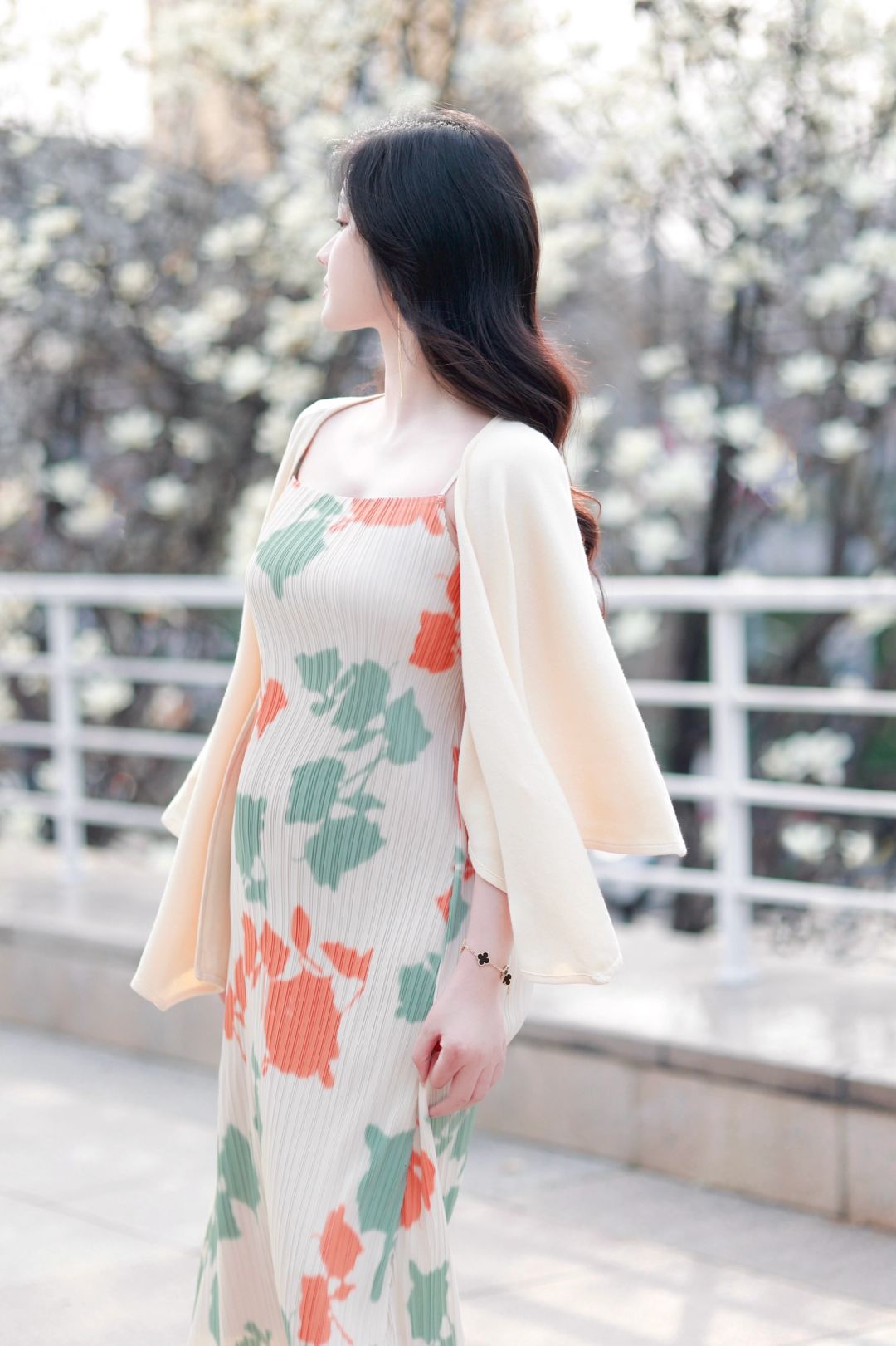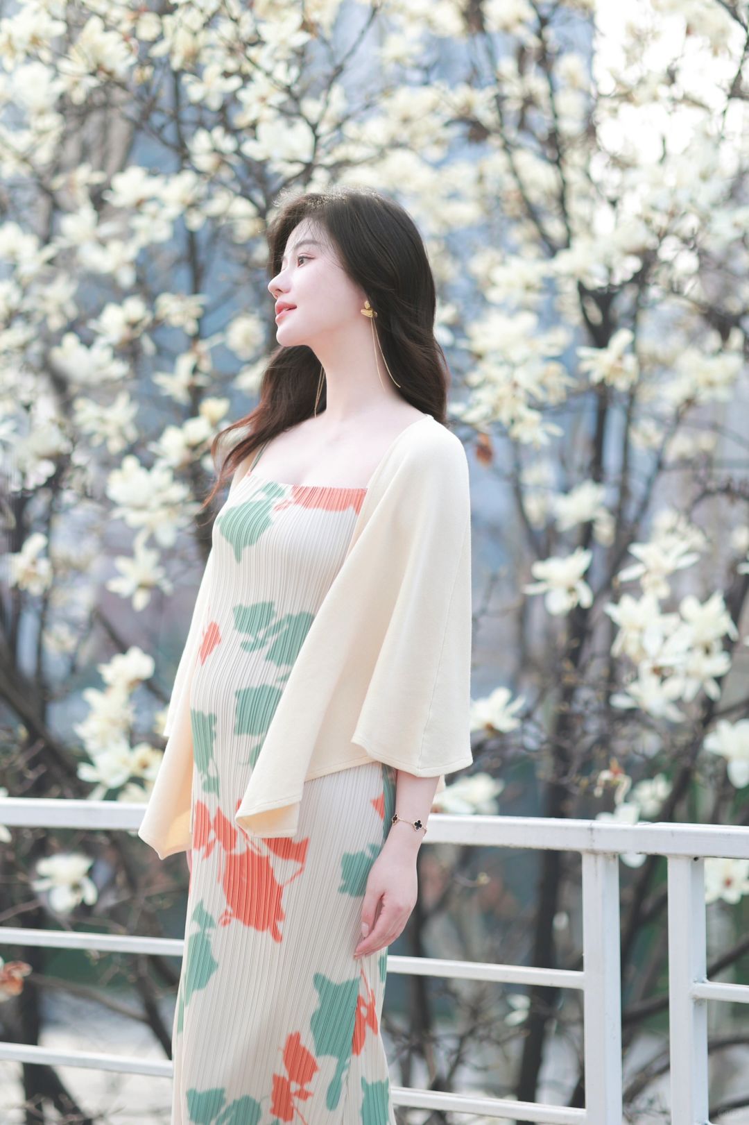 今日这条水墨画褶皱裙作为孕妇裙太合适了,披一条同色系披肩,仿佛是风有了形状。